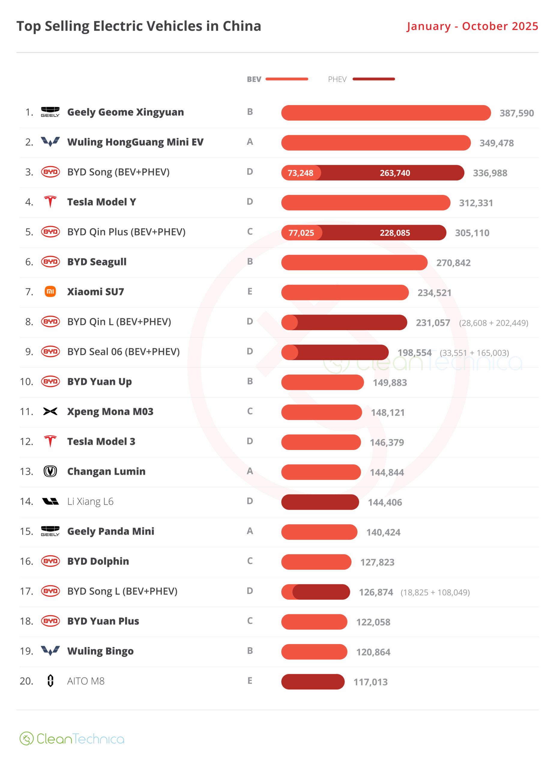 Looking at the overall manufacturer ranking (not just electrics), it seems BYD has found the demand ceiling in its domestic market. October was another month in red, as it saw its sales crash by a significant 38% YoY, to some 255,000 units, the fourth month in a row of drops.