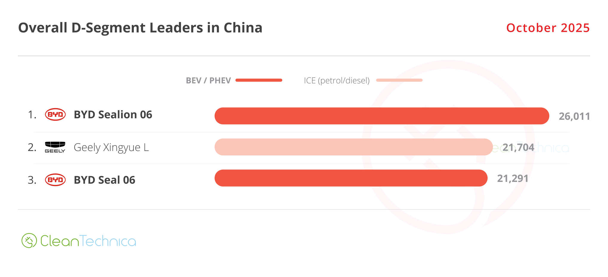 Looking at individual models, the biggest surprise was the podium for the midsize category. Besides the surprise appearance of the #2 Geely Xingyue L, the BYD Sealion 06 won the category title in October, while its sedan relative, the Seal 06, won the bronze medal.