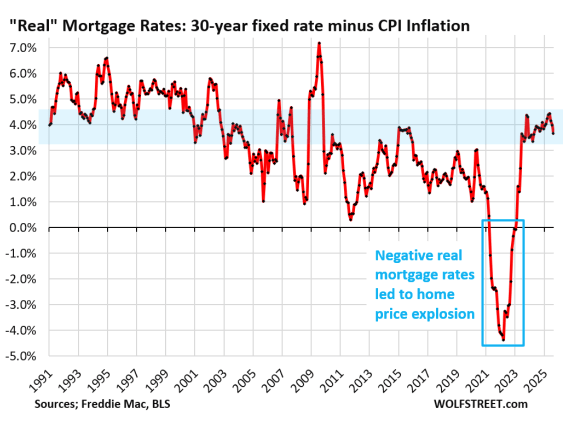 “That home-price explosion was a result of the Fed’s reckless monetary policy that created 30-year fixed mortgage rates below 3 percent, while inflation had begun to rage and was heading to 9 percent. The Fed, with its reckless policies, orchestrated negative ‘real’ mortgage rates of -3 percent, -4 percent, and even lower – better than free money, and when money is free, buyers’ brains turn to mush, and prices don’t matter. Then the music stopped.”