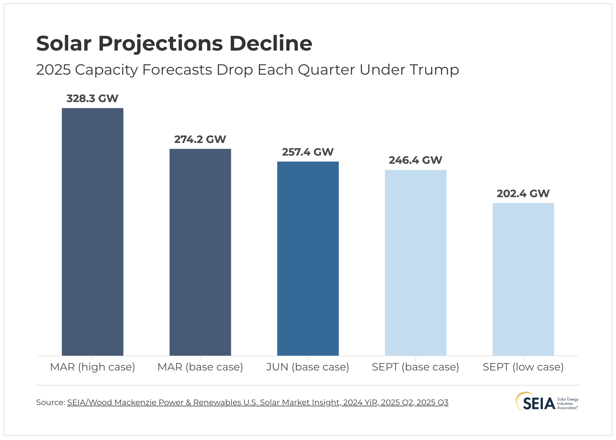 In SEIA’s and Wood Mackenzie’s U.S. Solar Market Insight (SMI) 2024 Year in Review released in March, forecasts showed a consistent pace of more than 40 GW of new solar additions annually through 2030. However, due to the onslaught of energy subtraction policies, forecasts for new solar deployment have declined each quarter that President Trump has been in office. The low-case forecasts in the latest SMI report show that these policy attacks could result in a 27% decline in new solar capacity from 2026–2030.
