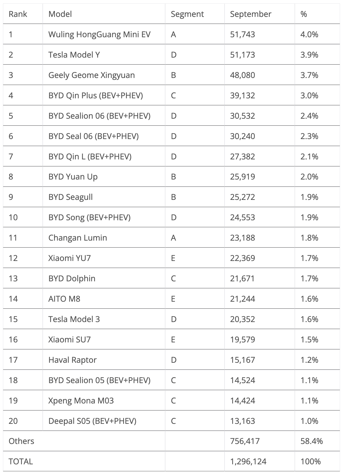 Further below, there was good news for BYD, with the Yuan Up climbing two positions in September to #13. But the Climber of the Month was the cute Changan Lumin, which jumped from 18th to 15th position.