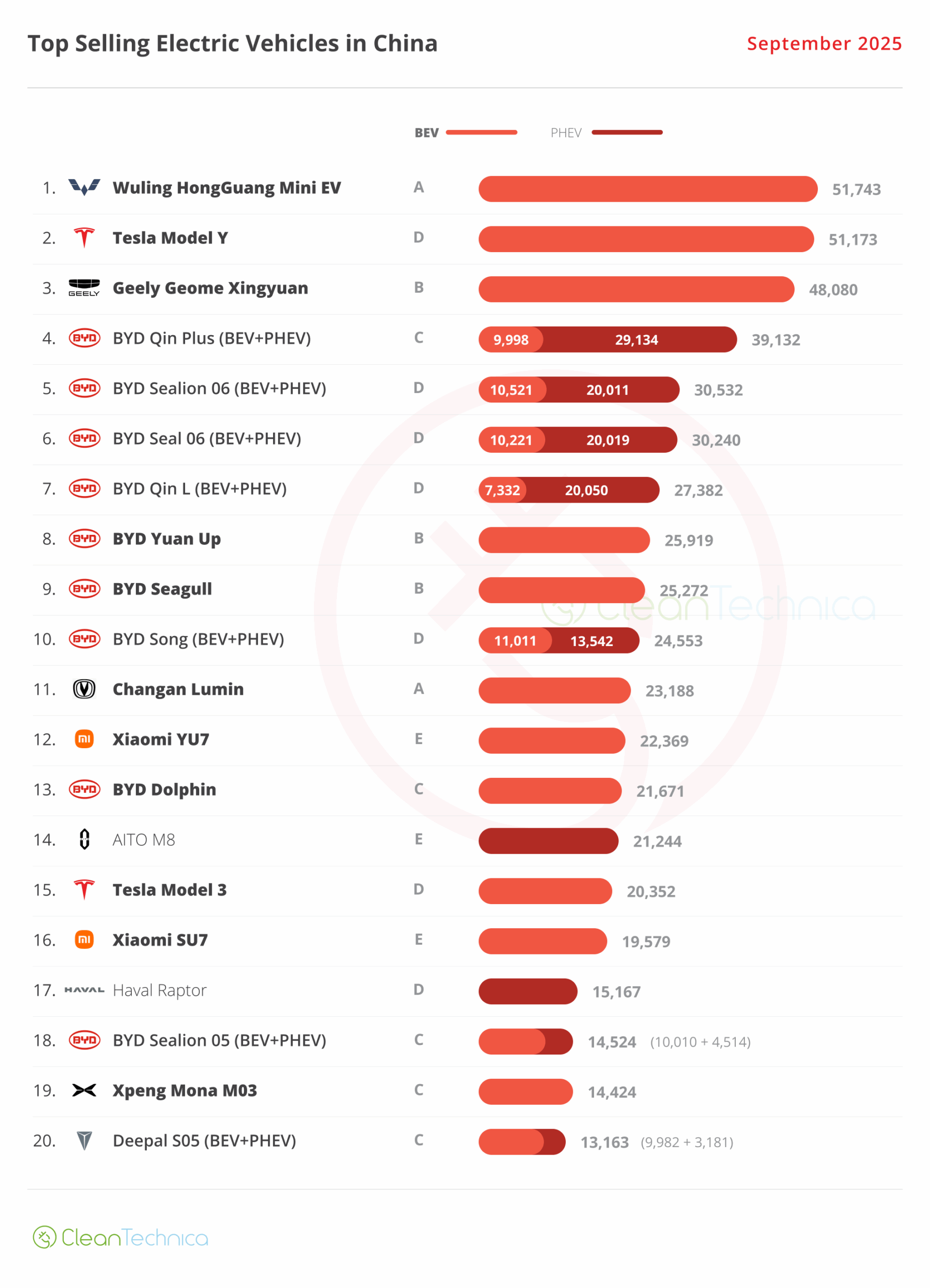 Further below, there was good news for BYD, with the Yuan Up climbing two positions in September to #13. But the Climber of the Month was the cute Changan Lumin, which jumped from 18th to 15th position.