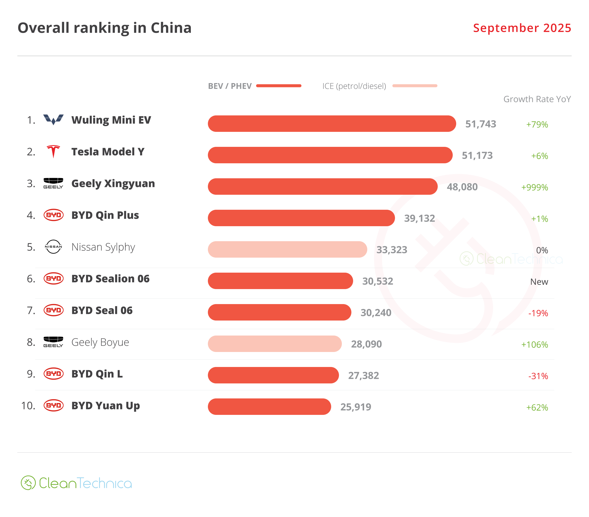 Last year’s silver medalist had a positive month in September, growing 6% YoY to 51,173 deliveries, in part thanks to its new 6-seat version. This provided it with a podium position. Tesla is clearly trying to stop the sales bleed with new variations, but will it be able to go back to the good old days? Unless Elon has a trick up his sleeve, I very much doubt it, especially with new competition like the Xiaomi YU7 and others like it. The YU7 got hundreds of thousands of locked-in orders within hours. Those orders have to come from somewhere, and with the market already at 50% share, it won’t be just from ICE models…. Yep, Tesla, but also BYD, will suffer.