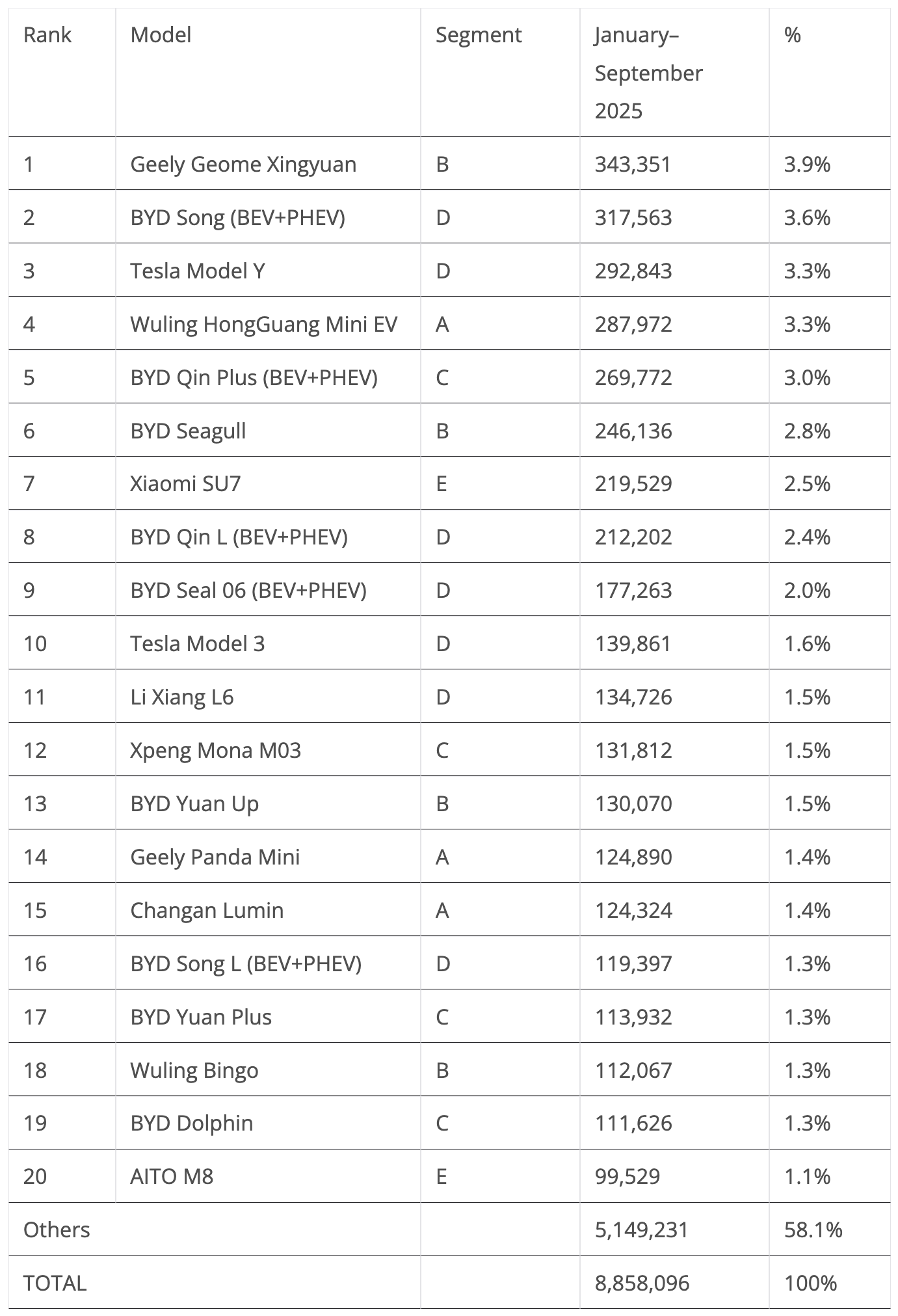 Further down, there were a few position changes. Despite a so so month in September (it saw its sales drop 15% YoY), the Tesla Model 3 benefitted from a horrible month from the Li Xiang L6 (down 52% YoY) to surpass it and reach the 10th spot.