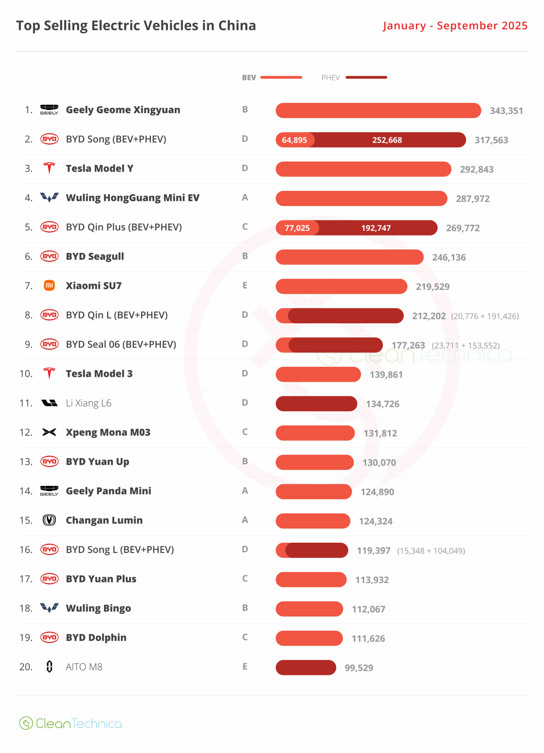 Elsewhere, while the Wuling Mini EV (A segment) and Geely Xingyuan (B segment) dominate their categories, the BYD Song has disappeared from the midsize podium, giving way to the recently introduced BYD Sealion 06, which now has the role of racing against the Tesla Model Y.