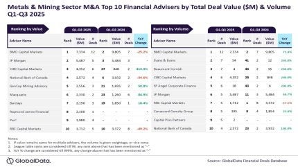 BMO Capital Markets led the mergers and acquisitions (M&A) financial advisory rankings in the metals and mining sector for the first three quarters of 2025 (Q1–Q3 2025), according to GlobalData, a data and analytics company.