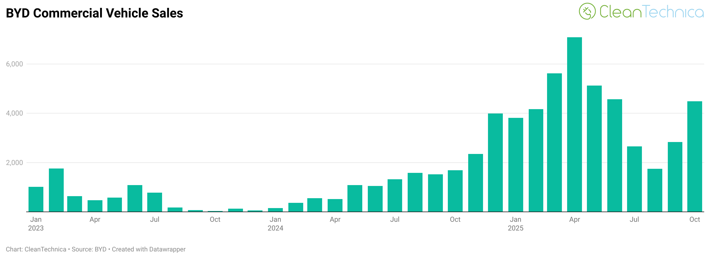 In contrast, its non-bus commercial vehicle sales were up a whopping 164.8% in October — going from 1,693 in October 2024 to 4,483 in October 2025. (And note that BYD scored only 37 such sales in October 2023.) The October 2025 sales total was not a new record, but it was the company’s highest total since June.
