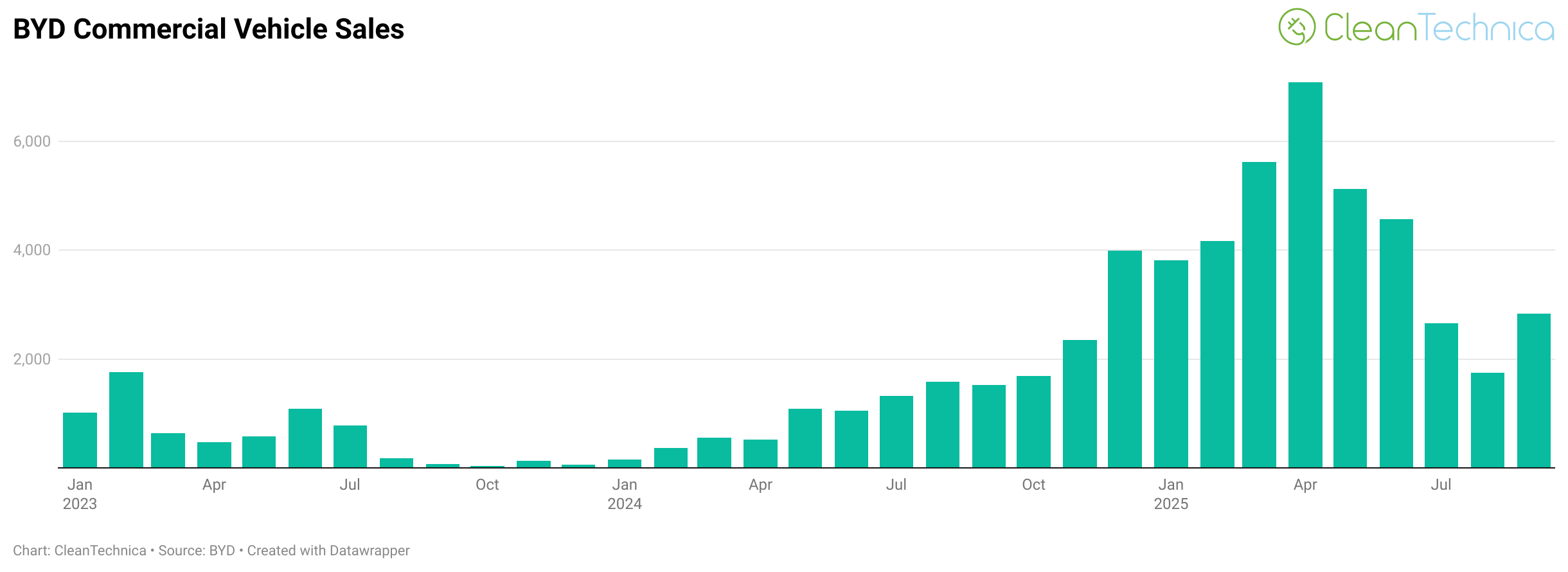 How about non-bus BYD electric commercial vehicle sales? (I’ll just call these electric trucks — though, there are some vans in there. BYD had another good month in this market. Sales were up 86.9% year over year in September, going from 1,517 in 2024 to 2,835 in 2025.