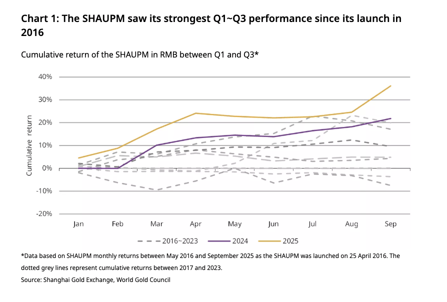 Local Chinese gold prices followed suit. The Shanghai Gold Benchmark Price PM (SHAUPM) gained 36 percent through the first nine months of 2025, charting the best year on record to date. The SHAUPM set new records 36 times through the first three quarters of the year, and the Shanghai price charted its best month on record in September.