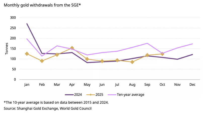 Withdrawals from the Shanghai Gold Exchange rose 6 tonnes month-on-month to 124 tonnes. That was 17 tonnes higher than October 2024, and nearly at the 10-year average of 127 tonnes.