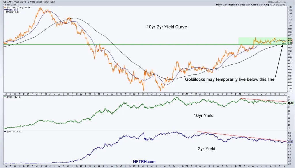The 10yr-2yr yield curve had steepened with a mildly disinflationary underpinning, as evidenced by the downtrends in its nominal 10 and 2 year yield components. Currently, as the curve travels sideways, neither steepening nor flattening, the question is whether Goldilocks may get an interim bid to end the year.