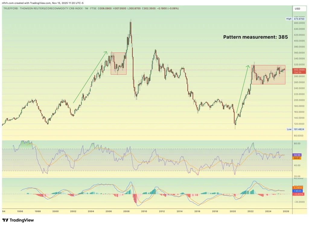 Meanwhile, this big picture chart of the CRB index appears to be biding its time. Again, we had much more detail in NFTRH 889, but this picture has a lot to say in its own right. Hint: while the current cycle has similarities to the cycle that ended rudely in 2008’s deflationary crash, there is reason to believe that will not be the case any time soon on this cycle.