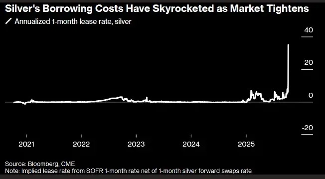 [Silver] Lease rates in London have exploded to 39%, a full-blown panic signal…. If banks can’t find the metal, they’ll be forced to buy back futures or deliver actual silver – both actions that could ignite a violent price surge.