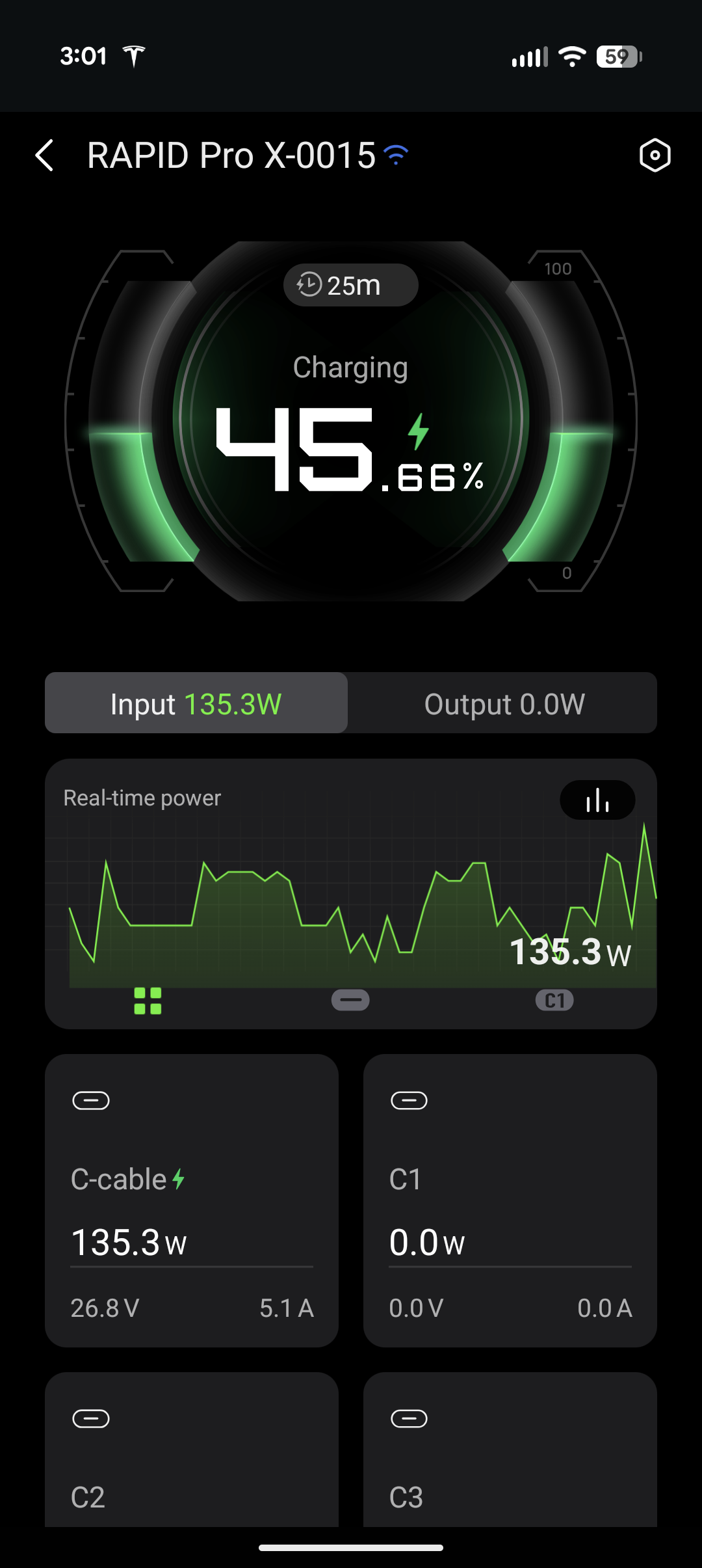 When it comes time to use the stored power, there are three USB-C ports on top. One of those can push out 140 watts while the other two can push out 65 watts each. The 140 watt port is bidirectional and can also be used to charge the unit.