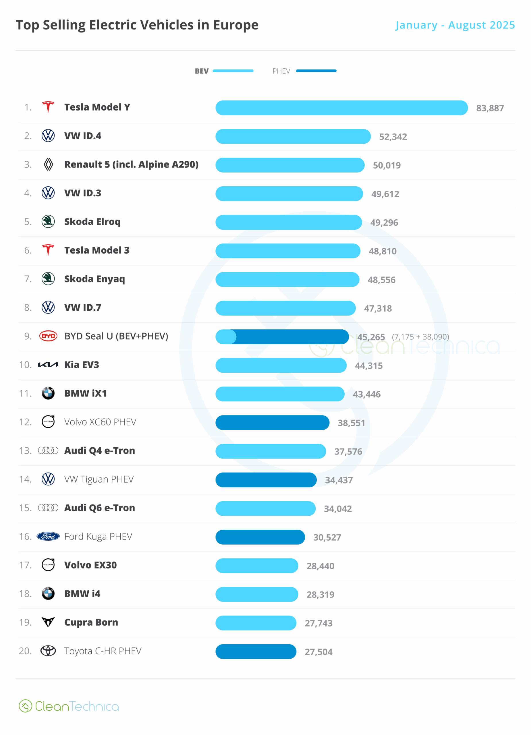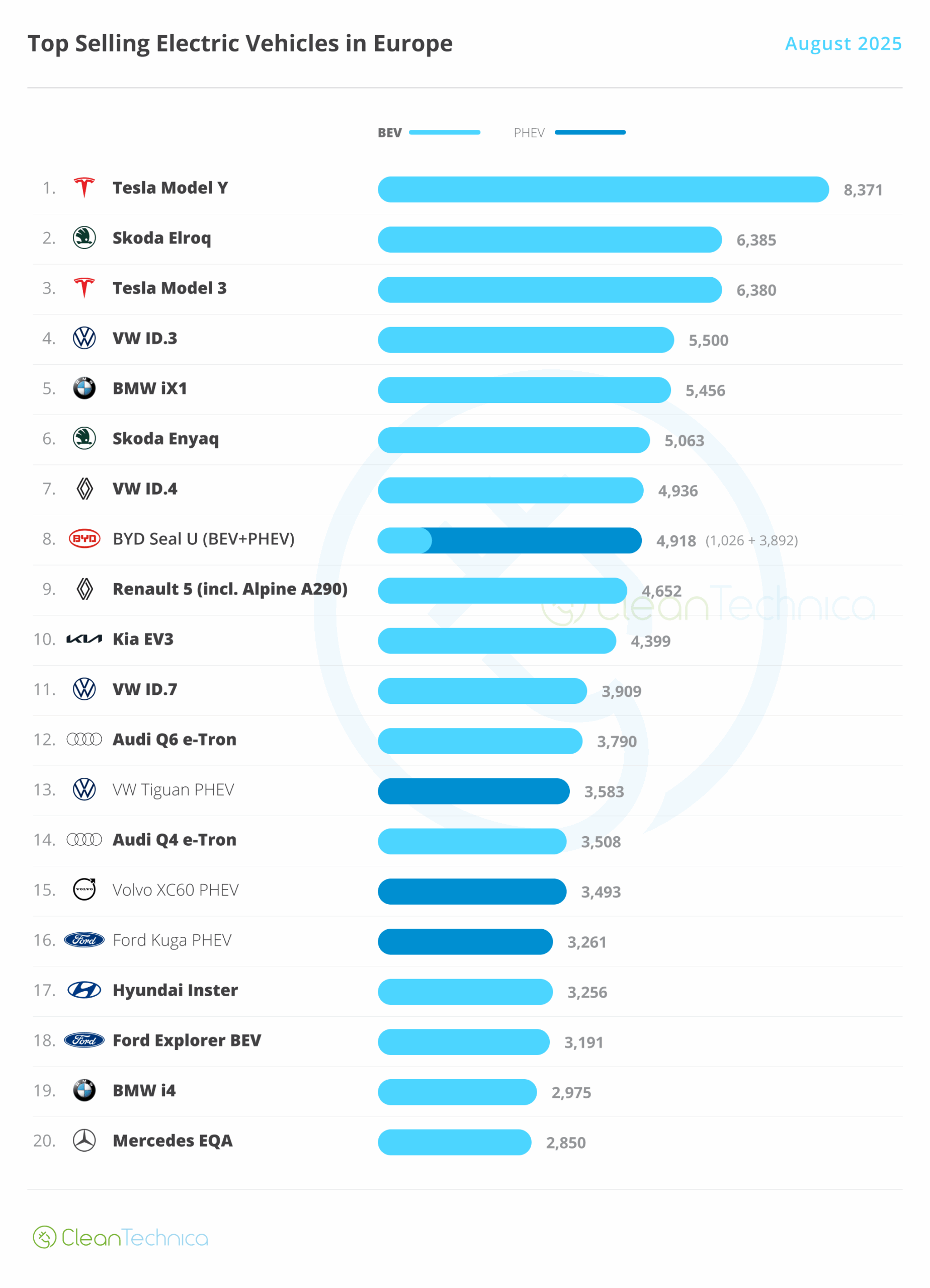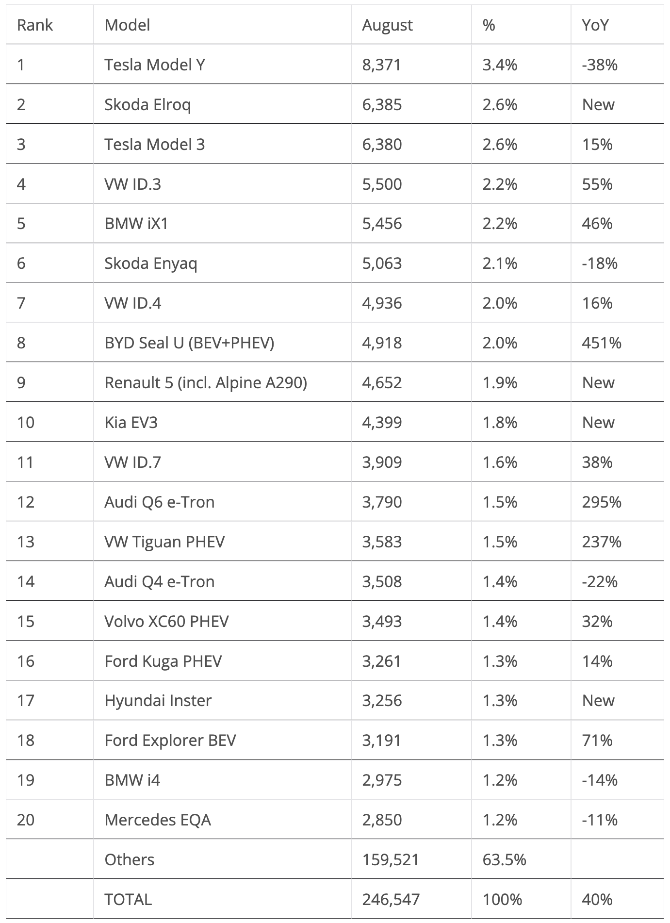 Looking at the 2025 ranking, as expected, August was a quiet month. The Skoda Elroq and Tesla Model 3 both rose two positions, to 5th and 6th, respectively.