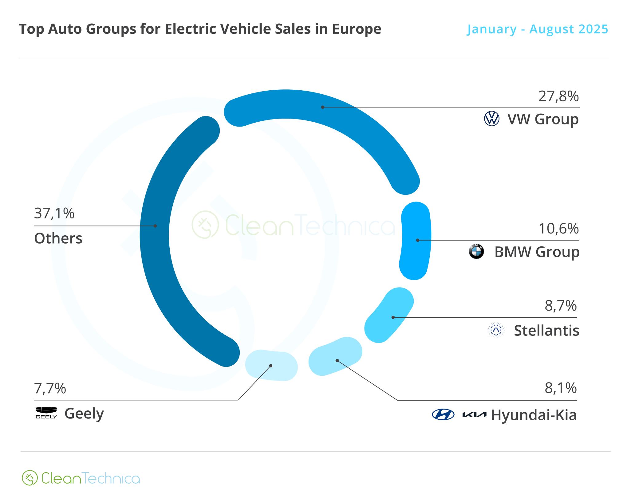 Arranging things by automotive group, Volkswagen Group is firmly in the lead, despite losing 0.2% share in August. It is now at 27.8% share, a market share that is comparable to BYD’s in China and Tesla’s in the USA. This is an important metric for the German conglomerate if it wants to stay relevant in a fully electrified global automotive market.