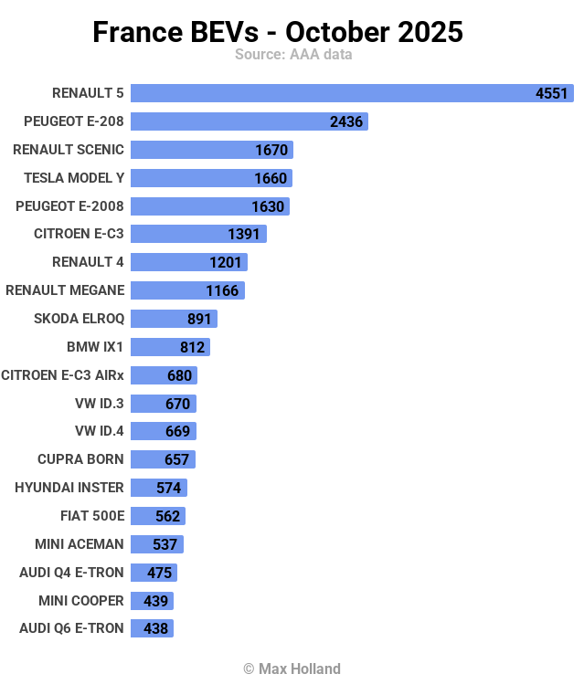 Despite its big September, the Tesla Model Y’s more modest October volumes have seen it fall back to second place this month, as the Renault 5 once again stands in the lead. The small Renault also has a big lead over the Tesla in the YTD race, so this is not just about the Renault’s outsized October result.