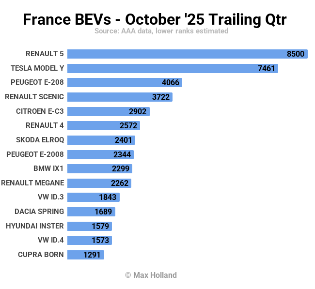 As usual, limited public data on auto sales means that we can’t detect launches of new BEVs in the French market. It’s notable however, that well over half of the top 20 volume is made up of models in A and B segments.