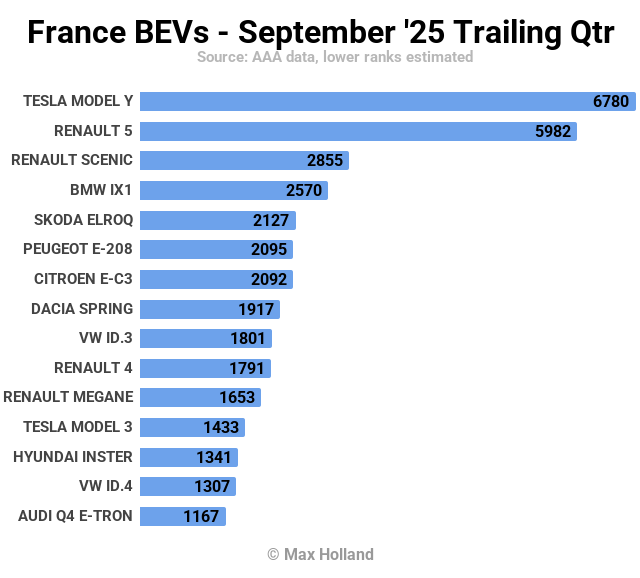 As usual, model sales data is limited for the French market (to roughly the top 20 only), preventing us from detecting low-volume debuts of newer BEV models. Keep an eye out for the reports from adjacent markets, to get a sense of what new models are arriving.