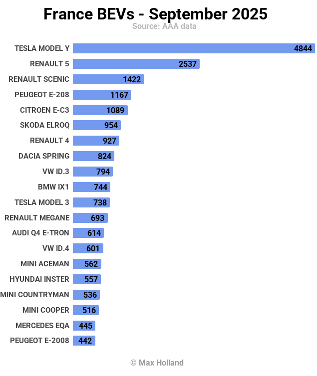 As usual, model sales data is limited for the French market (to roughly the top 20 only), preventing us from detecting low-volume debuts of newer BEV models. Keep an eye out for the reports from adjacent markets, to get a sense of what new models are arriving.