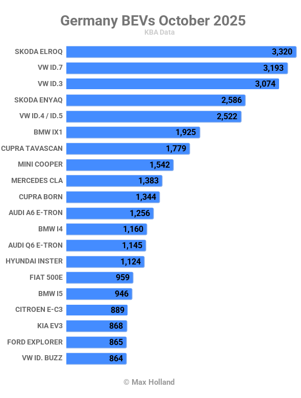 October saw plugin EVs take 33.3% share in Germany, up from 23.6% year on year. BEV volumes were up 48%, while PHEVs increased by 60%. Overall auto volume was 250,133 units, up some 8% YoY. The best-selling BEV was the Skoda Elroq.