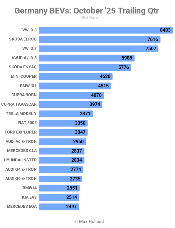 Leading the monthly sales in both August and September, the Volkswagen ID.3 still holds on to the lead in the 3-month chart. The Skoda Elroq has caught up considerably, and has now overtaken the ID.7, thanks to its big October.