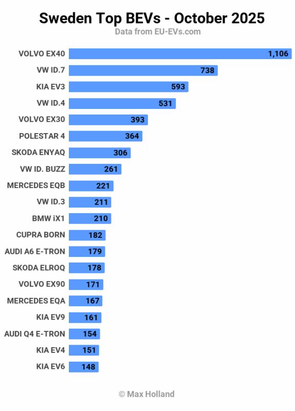 October saw plugin EVs take 65.7% share in Sweden, up from 62.2% year-on-year. BEV share grew marginally YoY, while PHEV share increased. Overall auto volume was 24,078 units, down 4% YoY. The Volvo EX40 was the best-selling BEV in October.