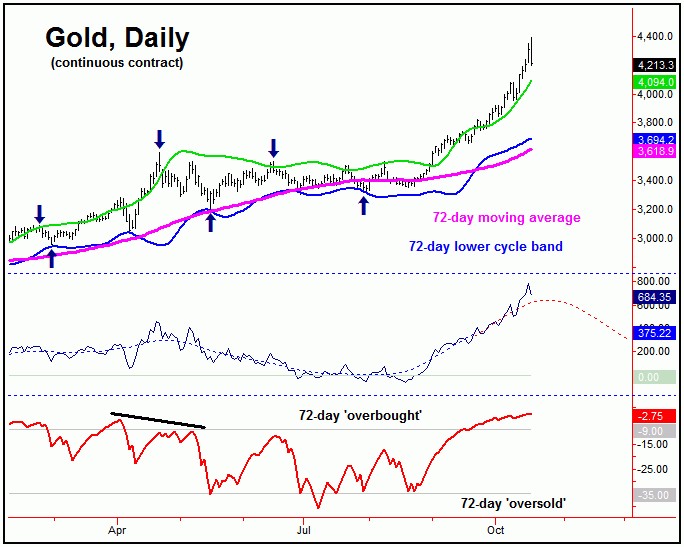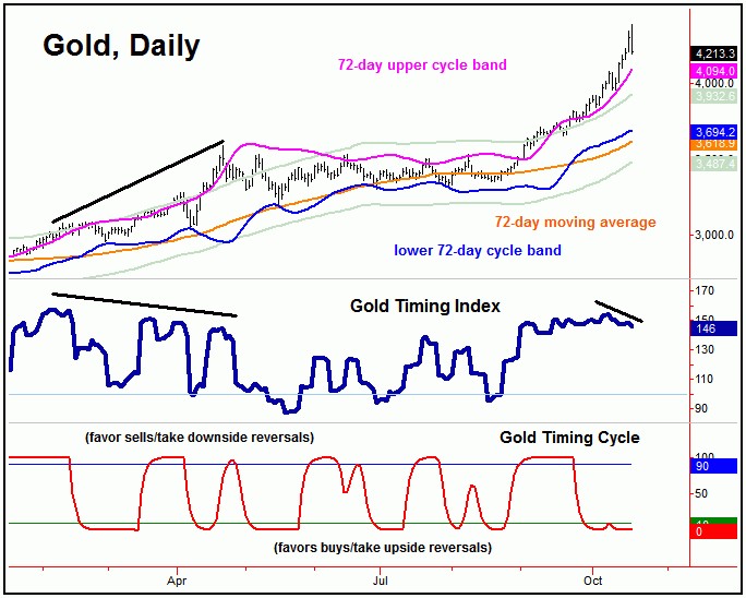 As mentioned last weekend, at 72-day (or greater) cycle tops, the Gold Timing Index tends to diverge from price action – which it had yet to do – thus favoring additional strength into last week, which we did see.