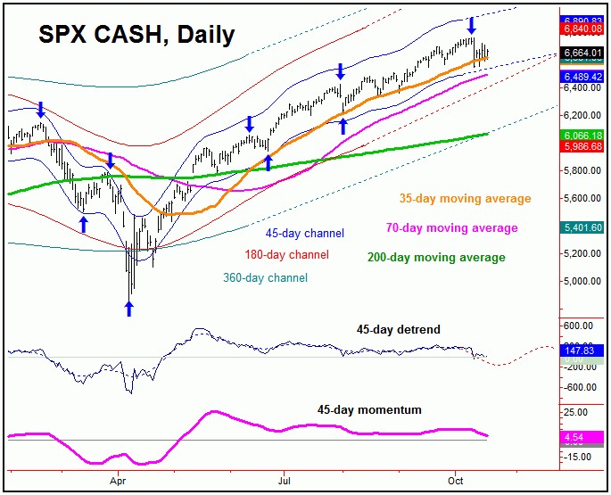 The last peak for this 45-day cycle in U.S. stocks was the 6764.58 swing top, registered on October 9th. Its next trough is due anytime between now and late-October.