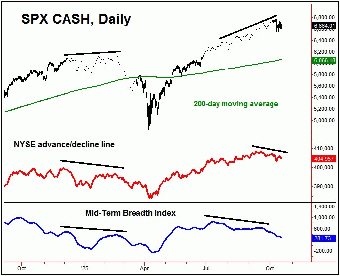 Adding to the notes above, our Mid-Term Breadth index (in blue) was also supportive of a correction, with this indicator starting to diverge all the way back in August. With that, until proven otherwise, the correction phase of our 45-day cycle is still deemed to be in force, and with that the potential for additional weakness before bottoming.