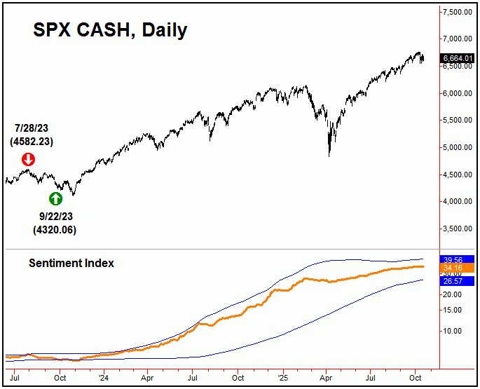 Lastly this weekend, our stock market sentiment index (chart, next page) currently is on a mid-term buy signal, with this signal coming all the way back on 9/22/23, at the 4320.06 SPX CASH figure, and shown on the chart below: