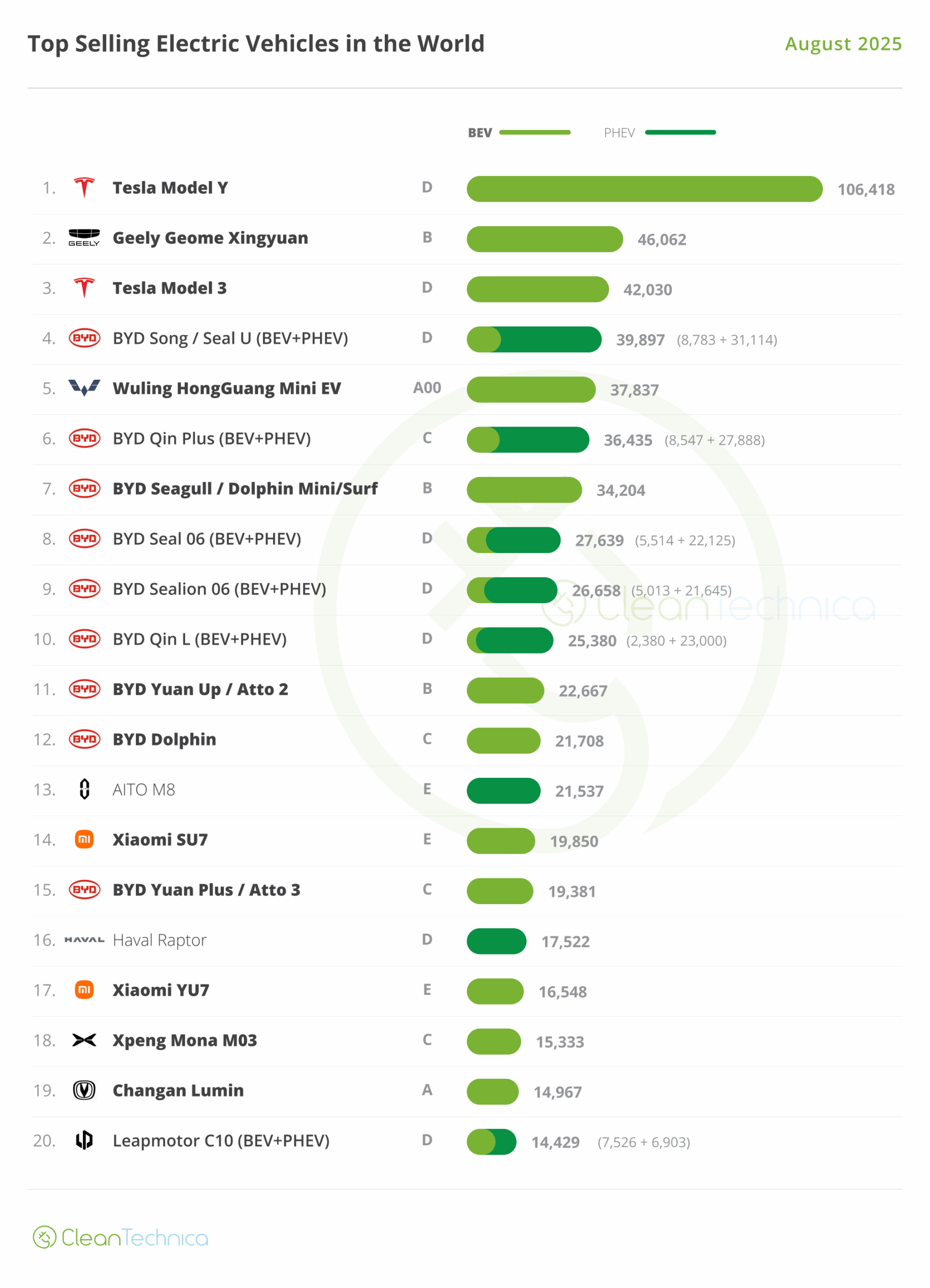 20 Best Selling EV Models in the World in August — Geely Xingyuan Ascends to 2nd Place
