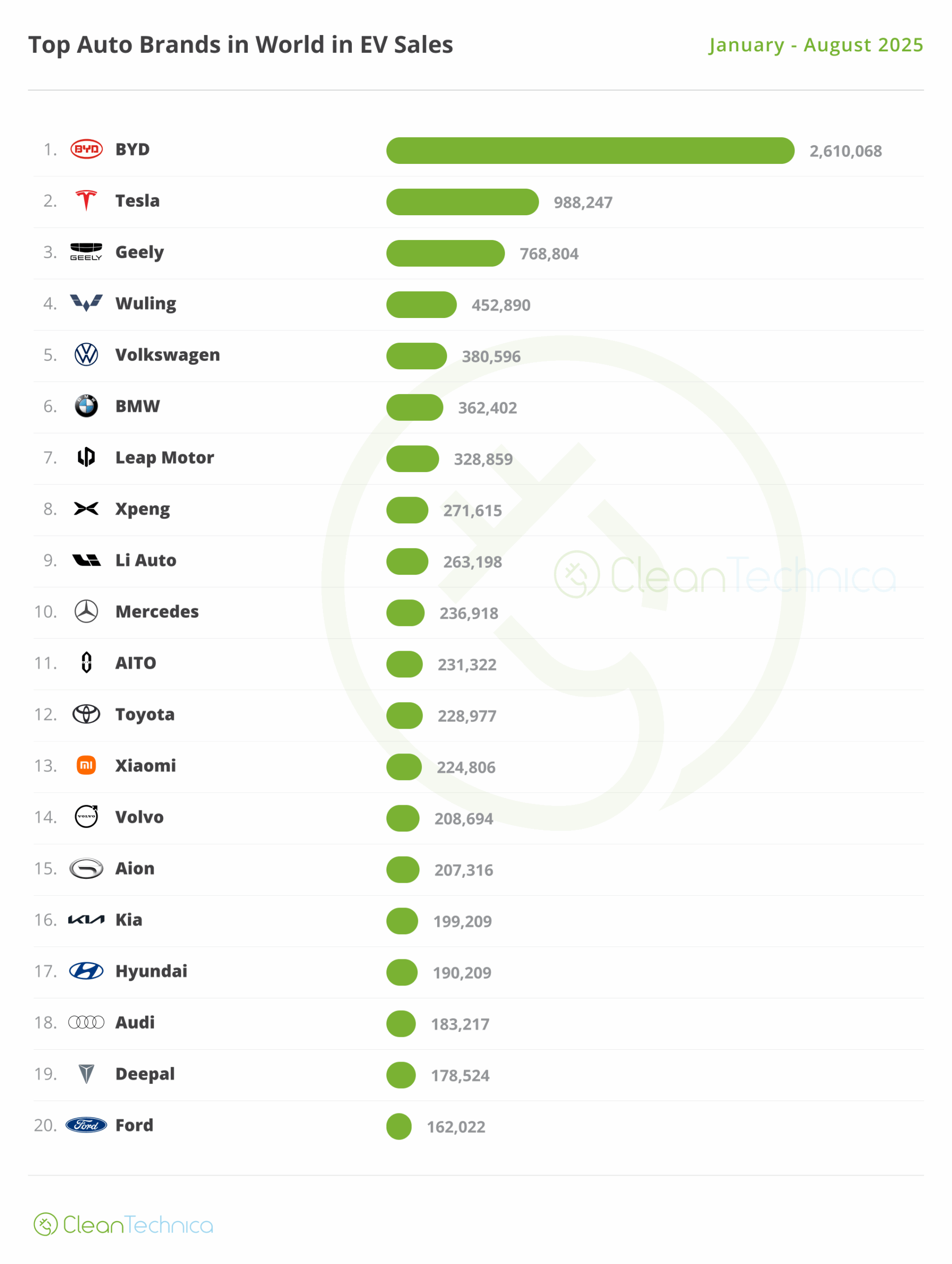 Still, comparing these two now to where they were a year ago, the contrast is stark. In August 2024, Tesla was the leader, with 17.5% share, while #3 Geely had 7.6% share….