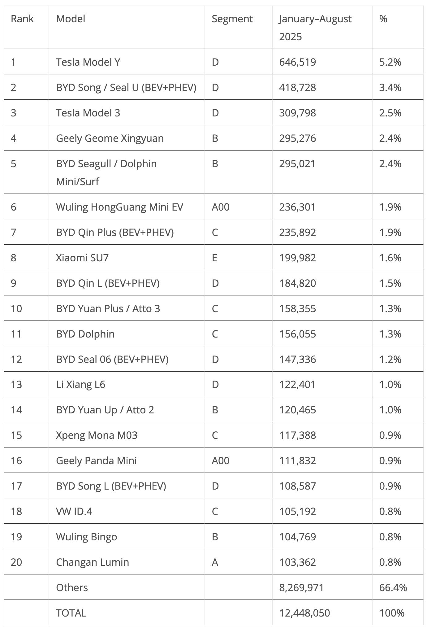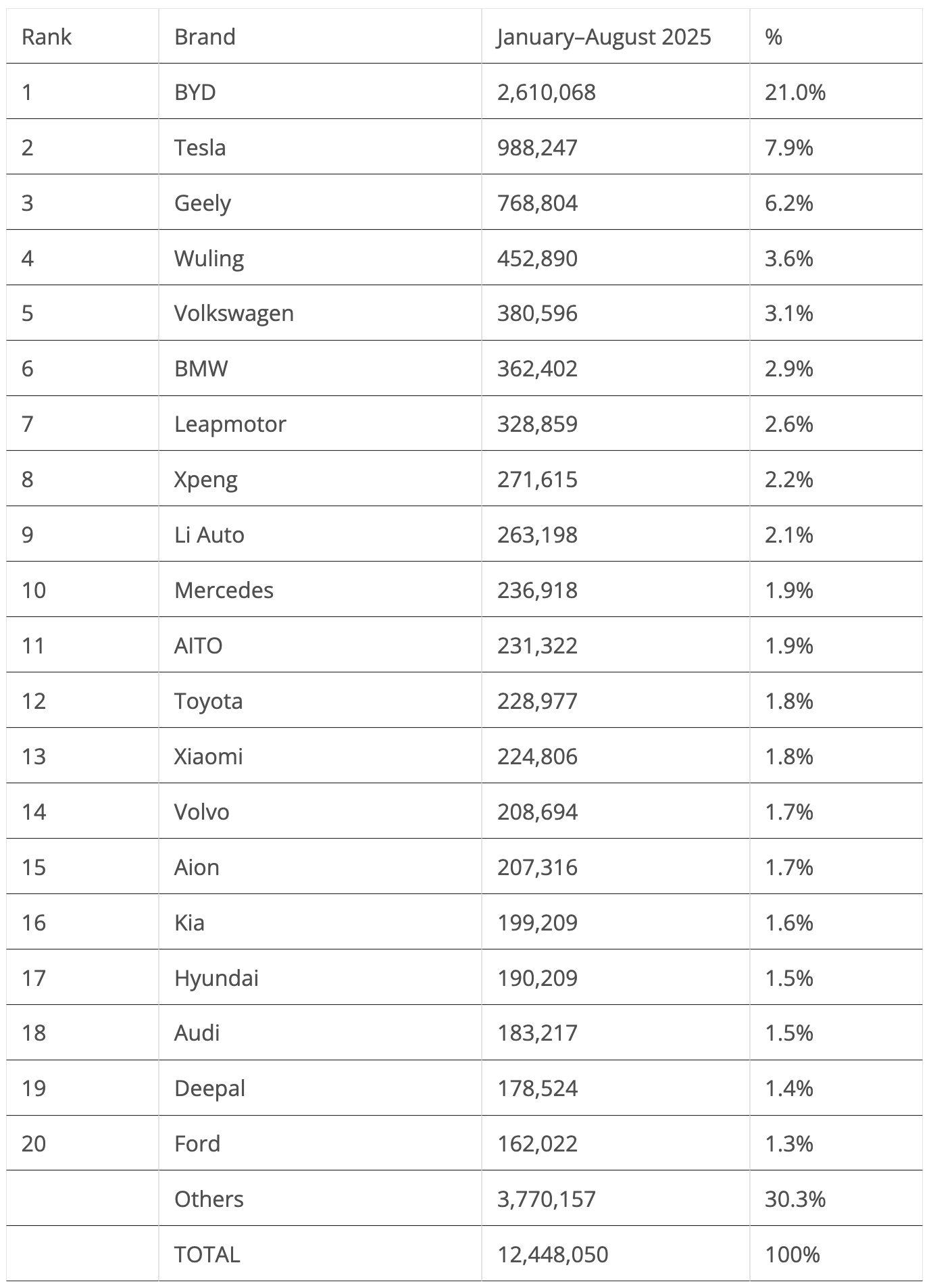 While BYD (17.1%) is stable in its leadership position, Tesla (12.1%, up 0.1% compared to July) gained some ground over #3 Geely (11.1%, down 0.1%).