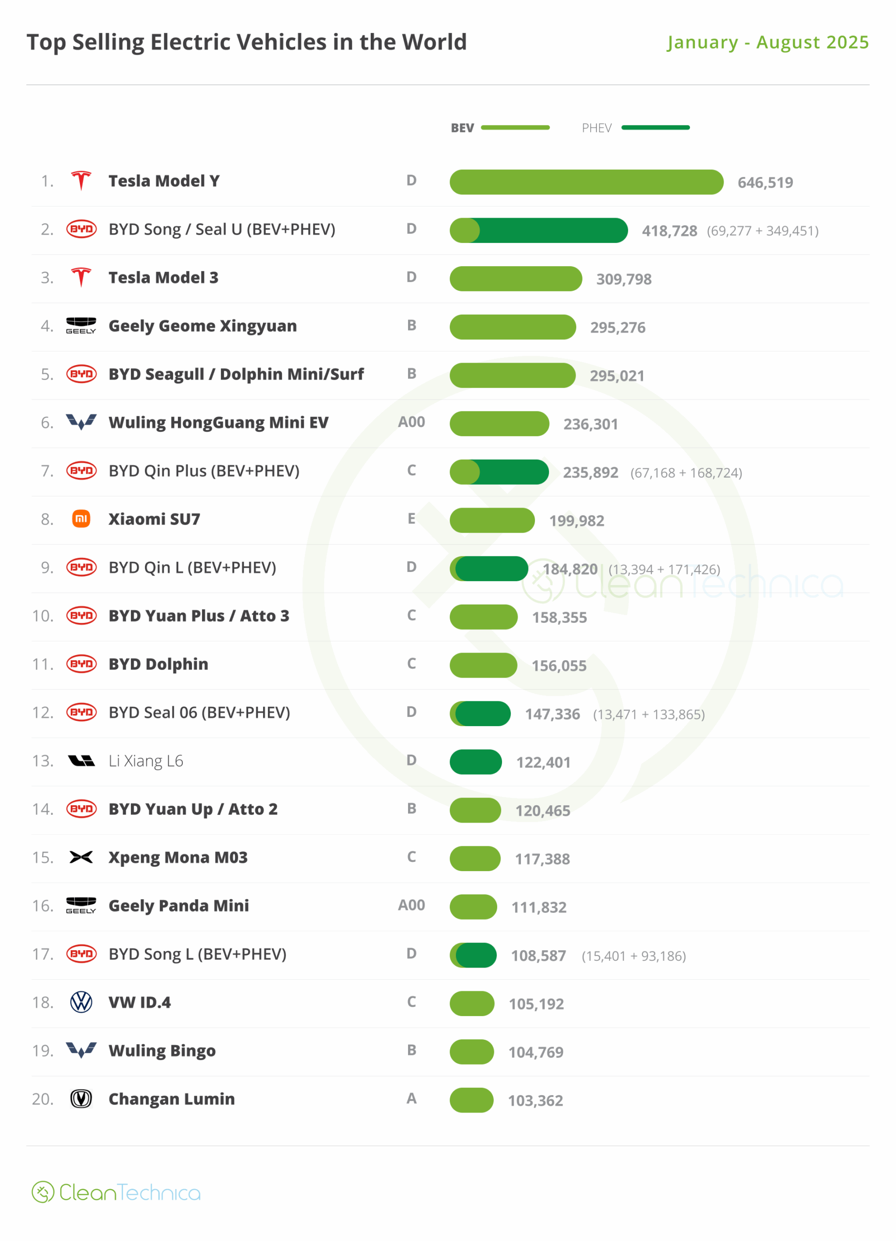 20 Best Selling EV Models in the World in August — Geely Xingyuan Ascends to 2nd Place