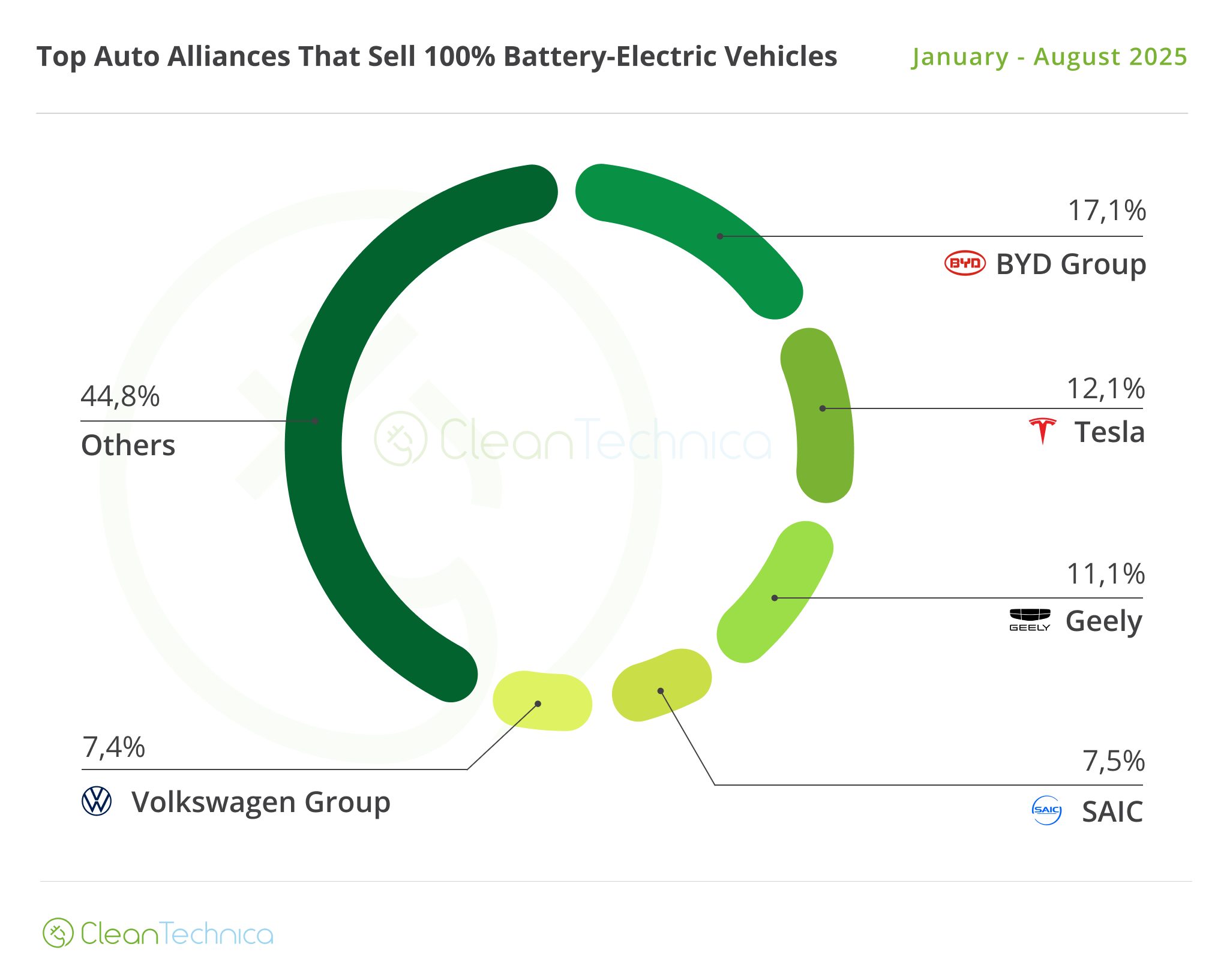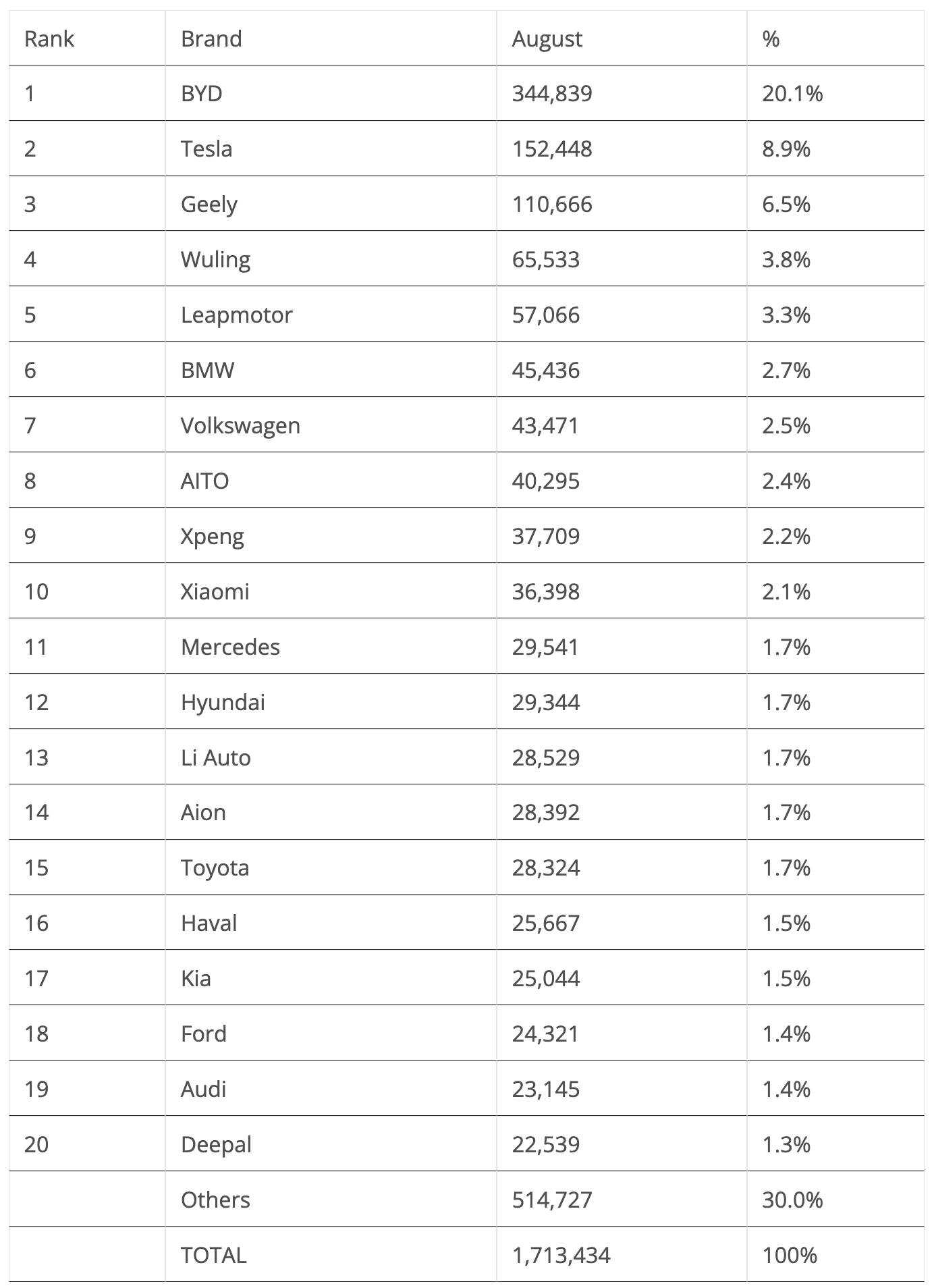 While BYD (17.1%) is stable in its leadership position, Tesla (12.1%, up 0.1% compared to July) gained some ground over #3 Geely (11.1%, down 0.1%).