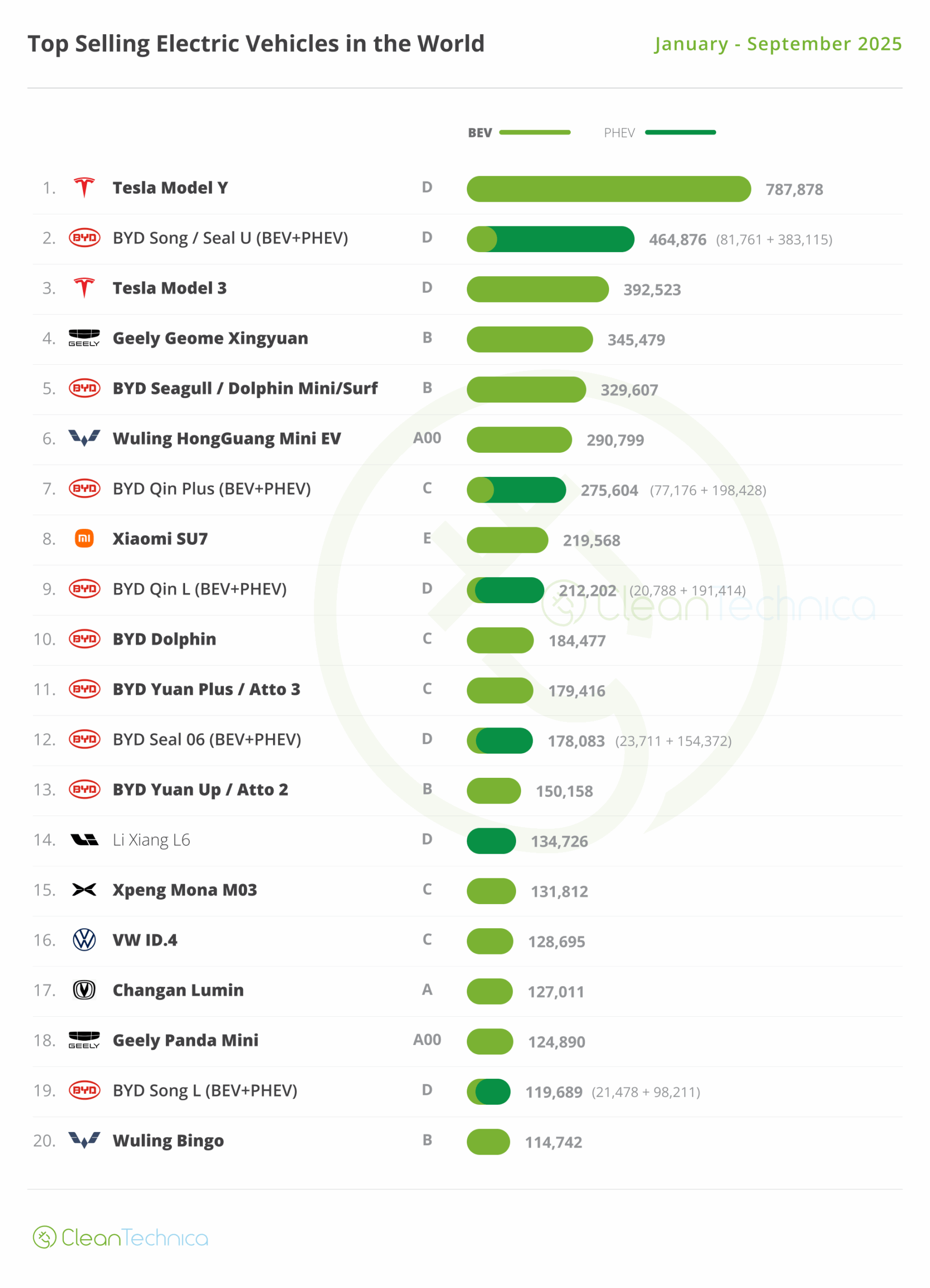 20 Best Selling EV Models in the World in September — Tesla’s #1 + #2 Positions Remind Their Fans of the Good Old Days