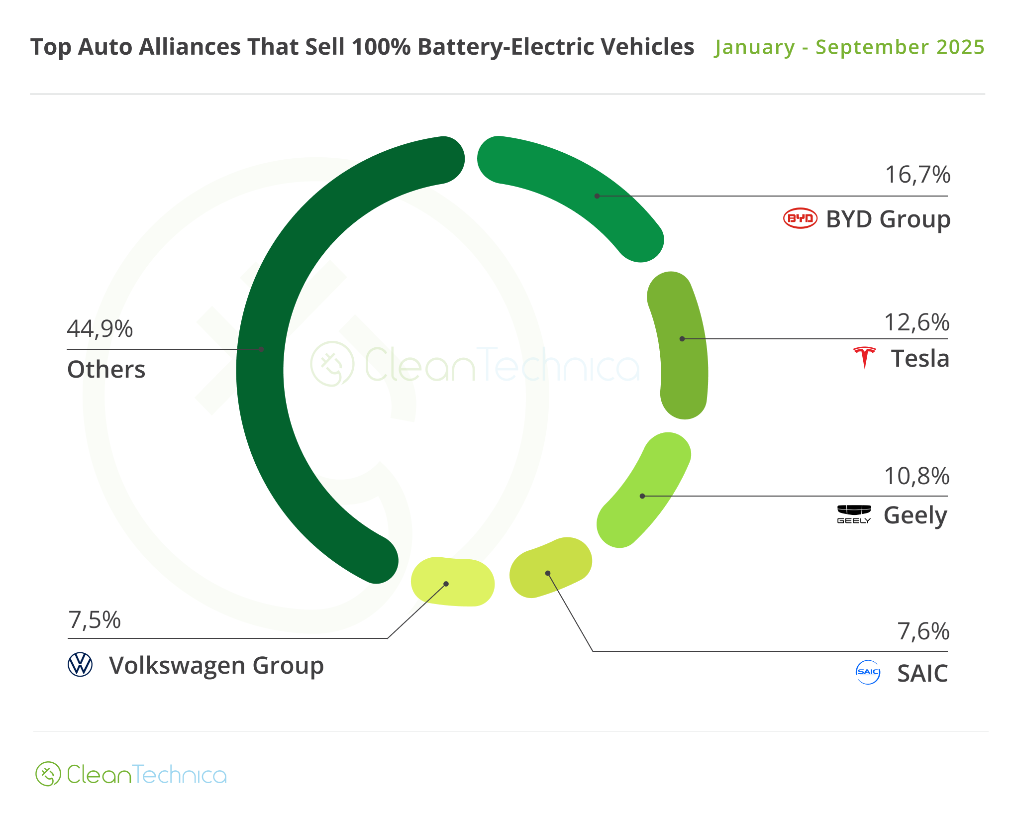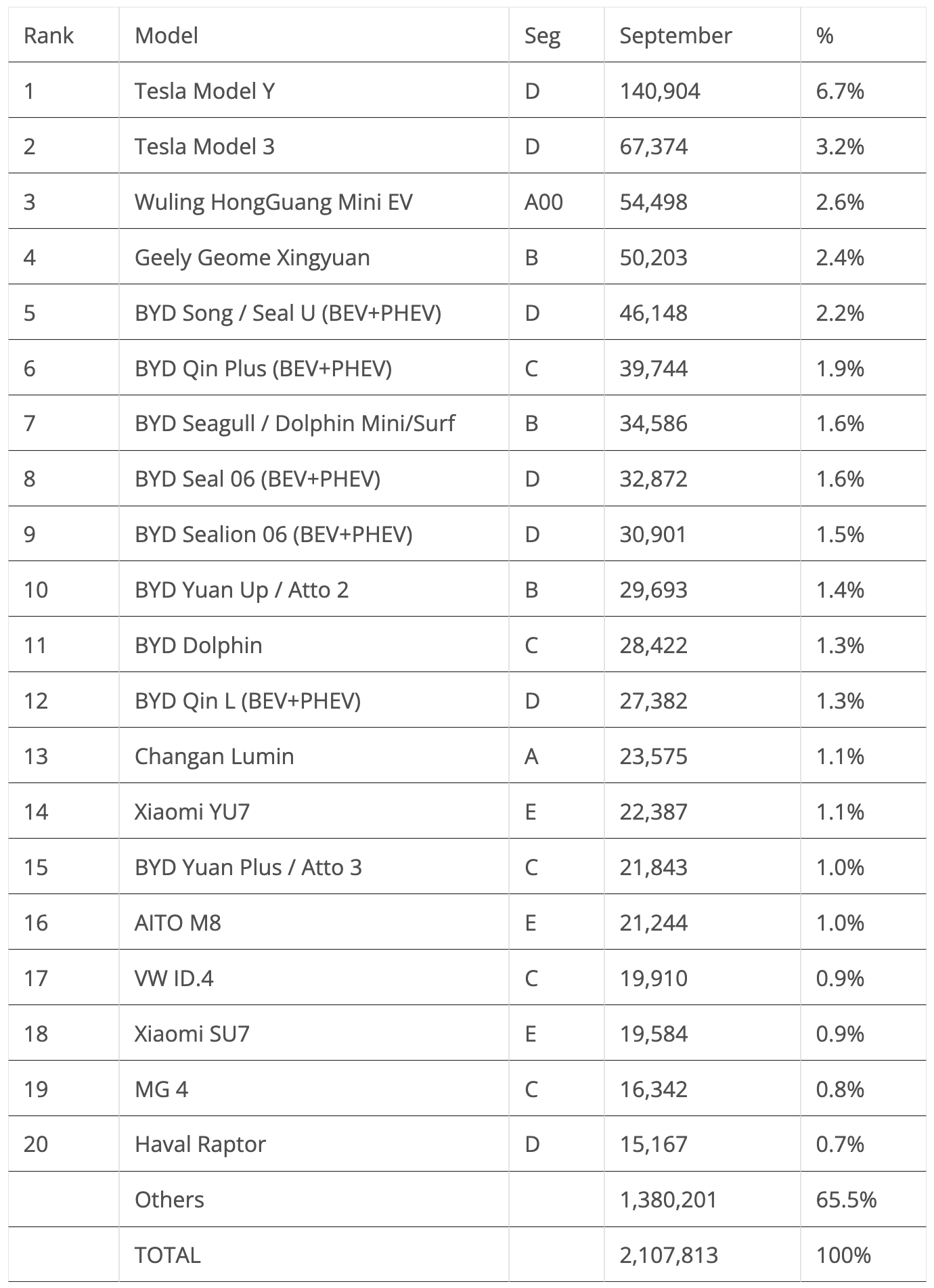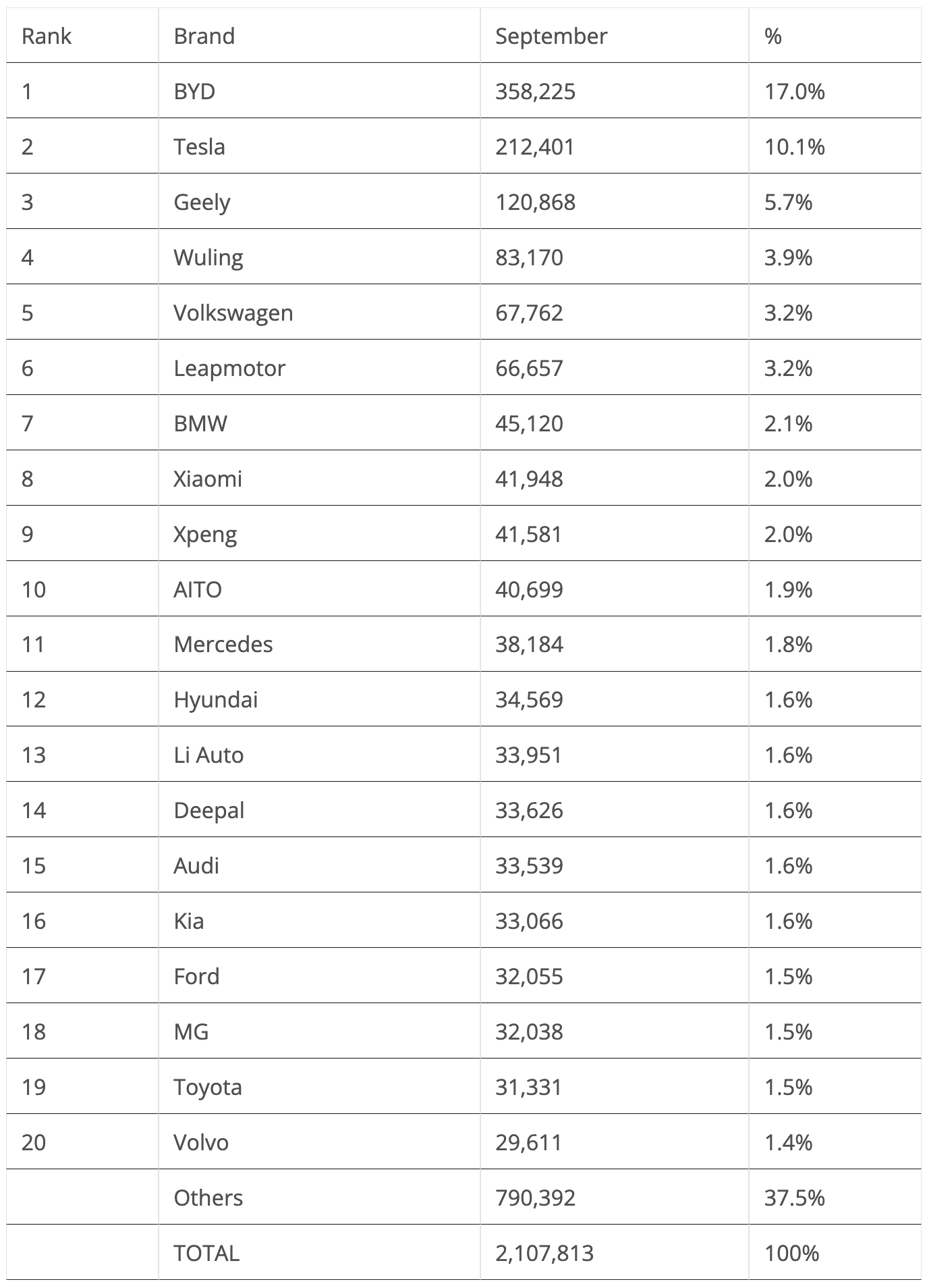 While BYD (16.7%) is stable in its leadership position, Tesla (12.6%, up 0.5% compared to August) gained precious ground over #3 Geely (10.8%, down 0.3%).