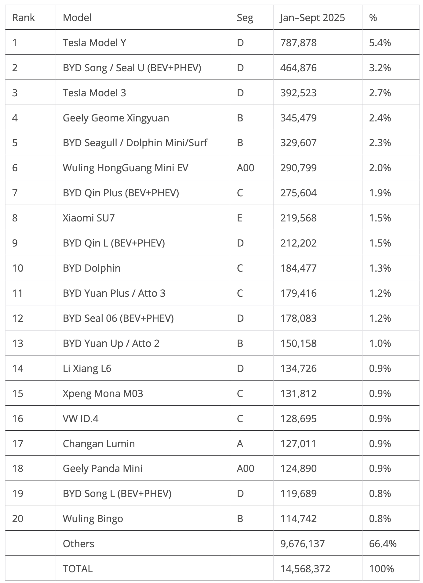 That left the Geely Xingyuan off of the podium, but its sales continue to rise, and with exports now starting to some markets, it should continue to grow throughout Q4. So, it will be one of the main candidates for a podium position in 2026.