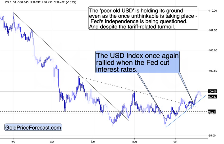 This week’s performance tells us why. What did the anti-USD asset – bitcoin – do in the last few days? It declined and even though it rebounded slightly it’s now back down to $100k.