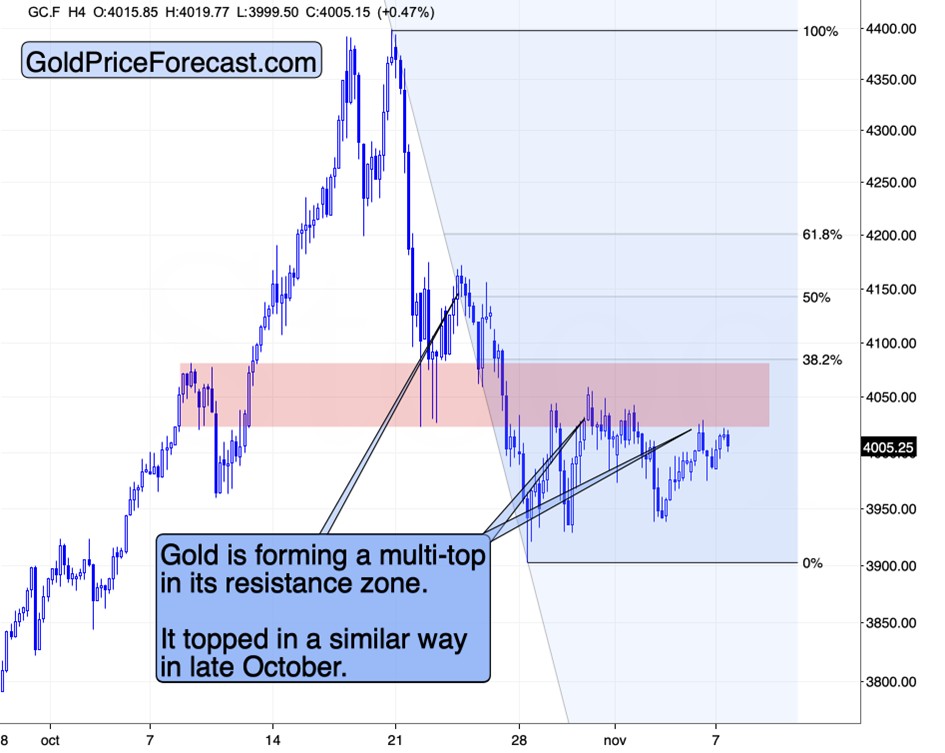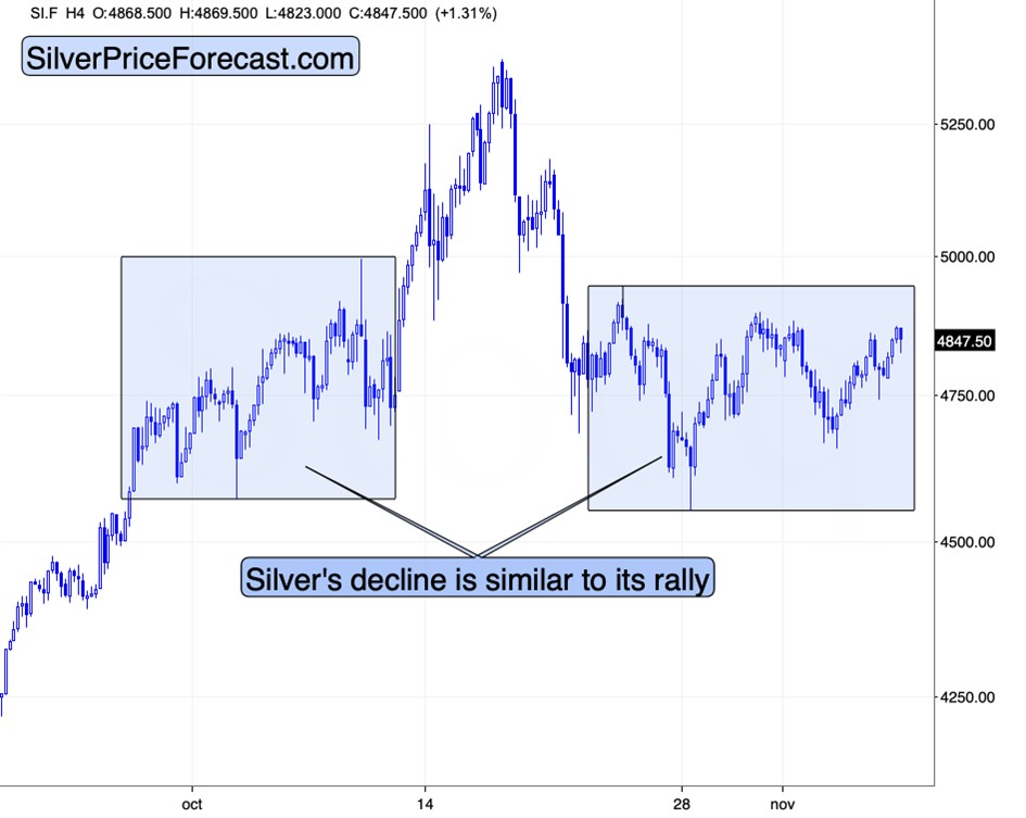 Please note how consolidations in both: gold and silver are horizontal – simple back-and-forth patterns. In gold’s case, that’s another multi-top, and in silver’s case it’s likely the right shoulder of a head-and-shoulders top.
