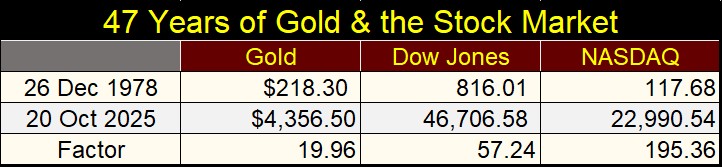 Note on the table below. In 1970, the NASDAQ Composite didn’t exist yet. The earliest data I have for it, is for 26 December 1978. So, that is the date I used for this comparison between the price of gold and the NASDAQ. Note gold in 1978, was no longer at $35.50 an ounce.