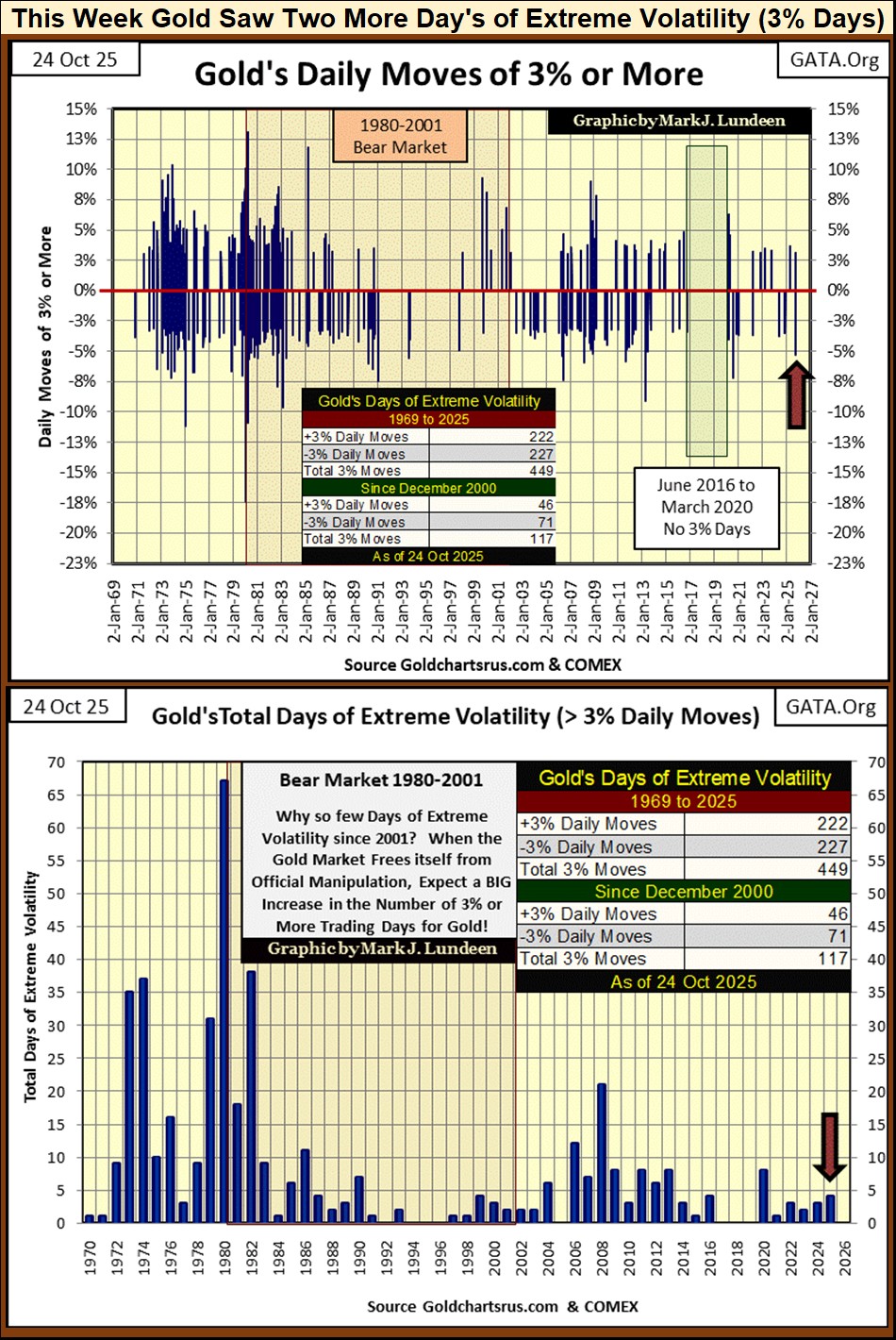 As seen in the chart above, these two 3% days for gold, doubled gold’s totals of extreme days for 2025, from only 2 last week, to 4 at this week’s close. Let’s see how high the total for extreme volatility will be for 2025. The higher the better, and negative 3% days are fine too.