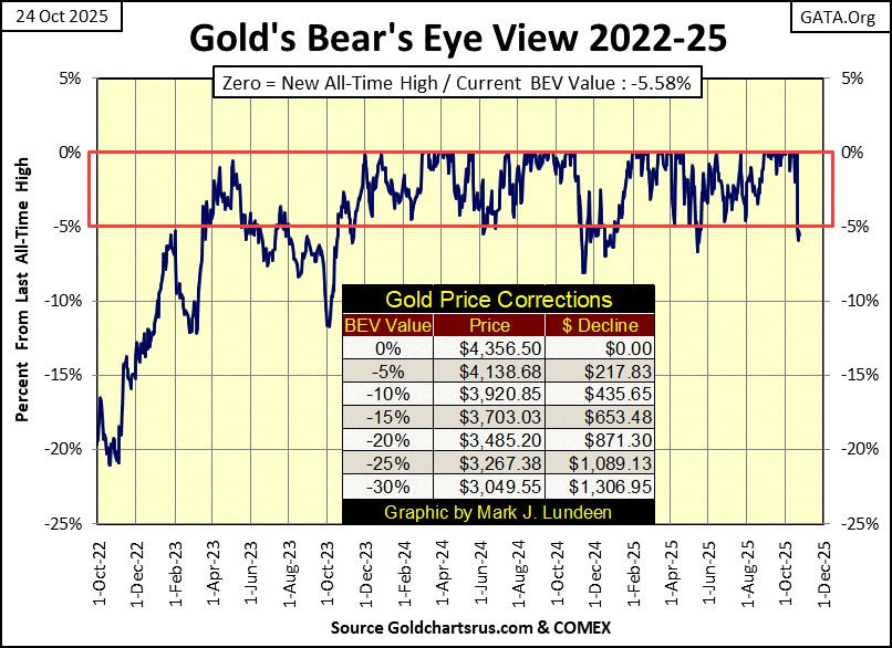 I’m just a market enthusiast. I make no claims of market certainty for what is to come in the future. But, over the years I’ve done alright. After making that disclaimer, looking at the Bear’s Eye View for the XAU above, if it can keep above its BEV -25% line during this correction, or 247 in dollar terms, I’d be happy with that.
