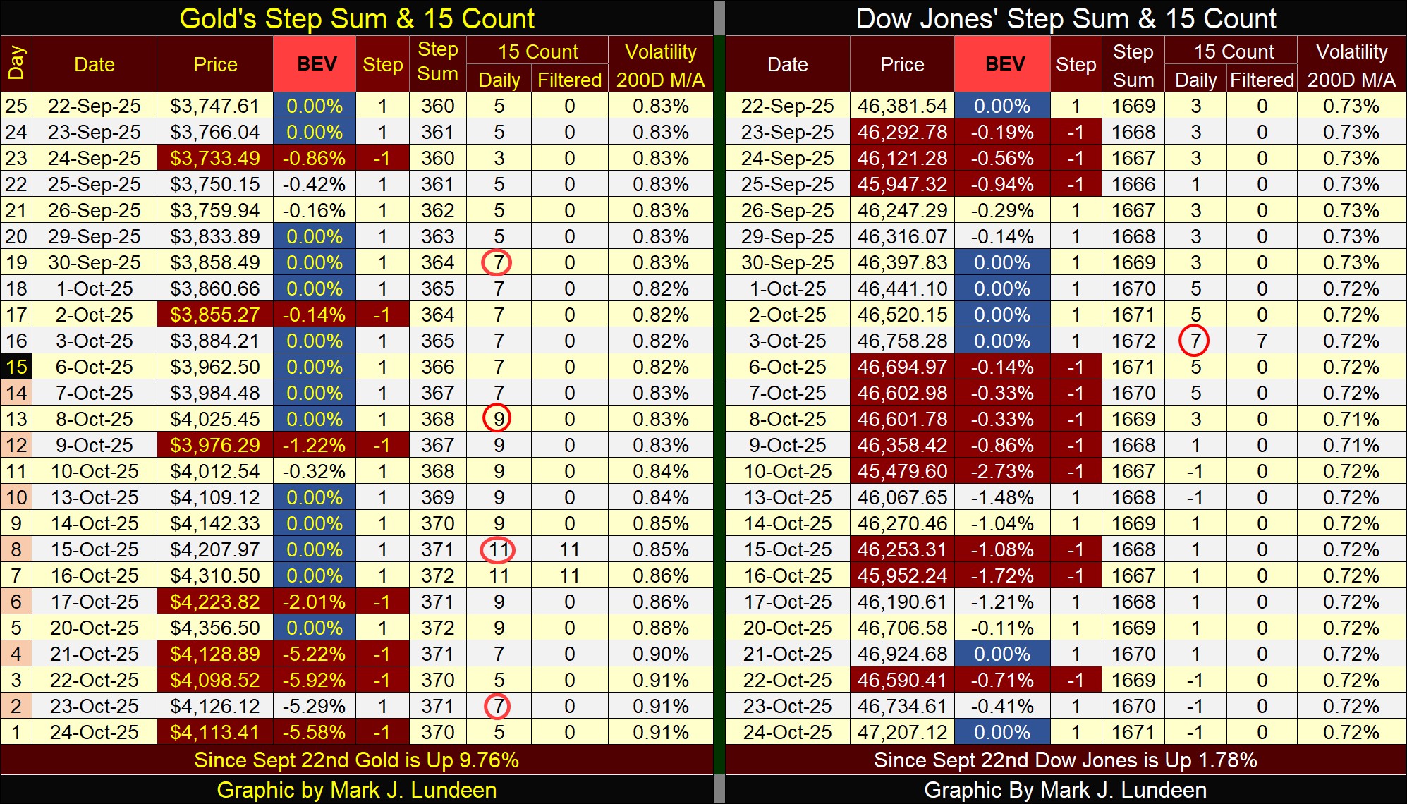 For gold in its step sum table below, last week its 15-count increased to an extremely overbought +11. Markets don’t like being extremely overbought. So, I’m not surprised seeing an increase in daily declines for this week, following gold’s last all-time high on Monday.