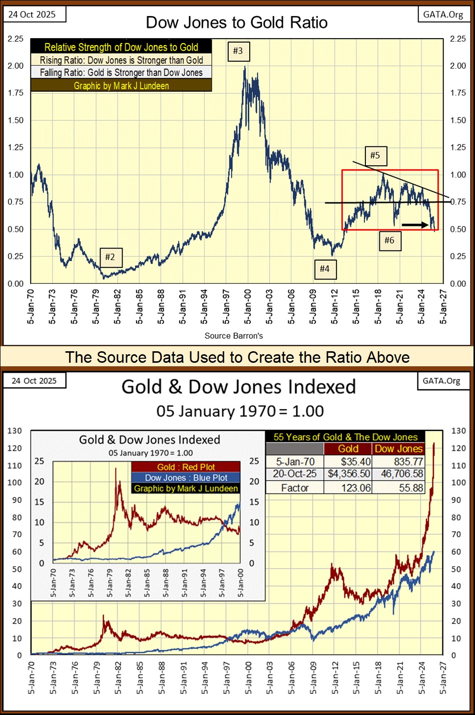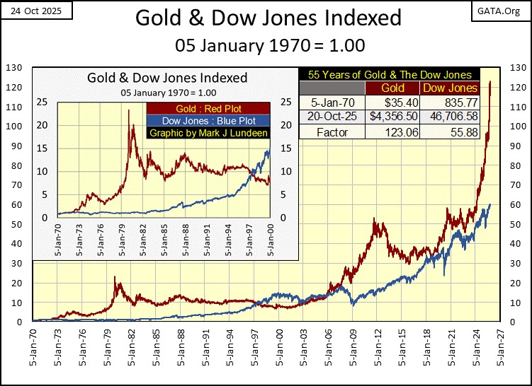 But, maybe most people are wrong about gold and the stock market. Below I’ve plotted the indexed values for gold (Red Plot) and the Dow Jones (Blue Plot), with 05 January 1980 = 1.00. Based on gold’s last all-time high on Monday this week, since 1970, gold’s advance during these fifty-five years, has been twice that of the Dow Jones. Strange, I’ve never seen this chart anywhere in the main-stream financial media. They also never publish charts going back decades, the type of charts I publish weekly.