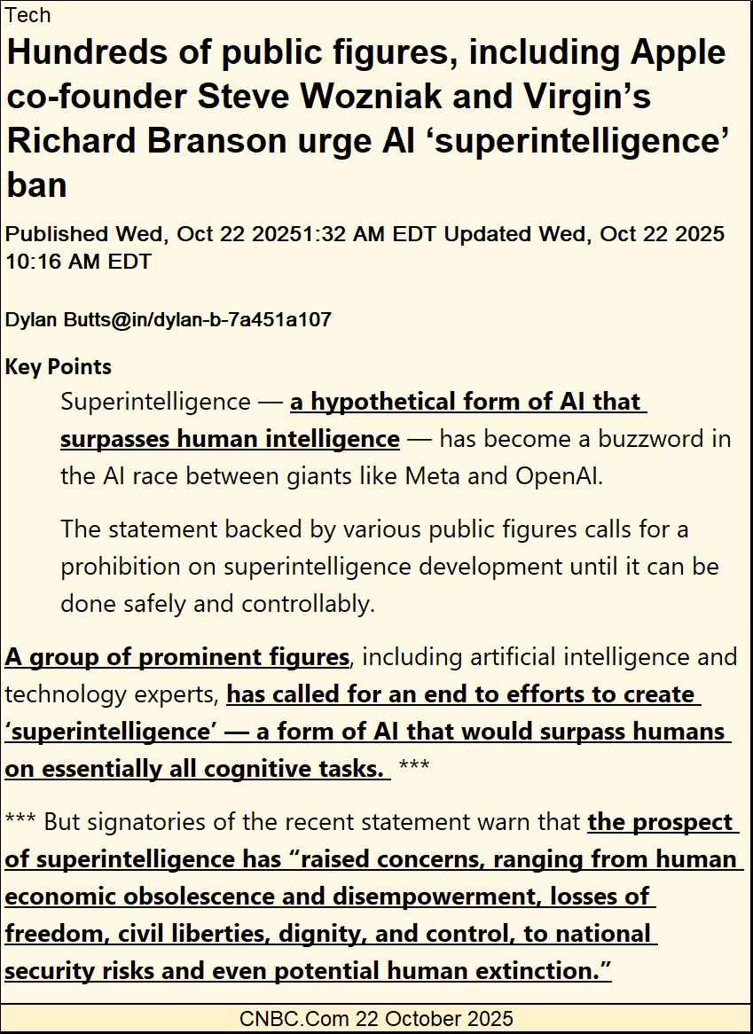 I bring this up, as I feel obligated to point out an approaching danger to humanity, that of AI, as reported in the CNBC article below.