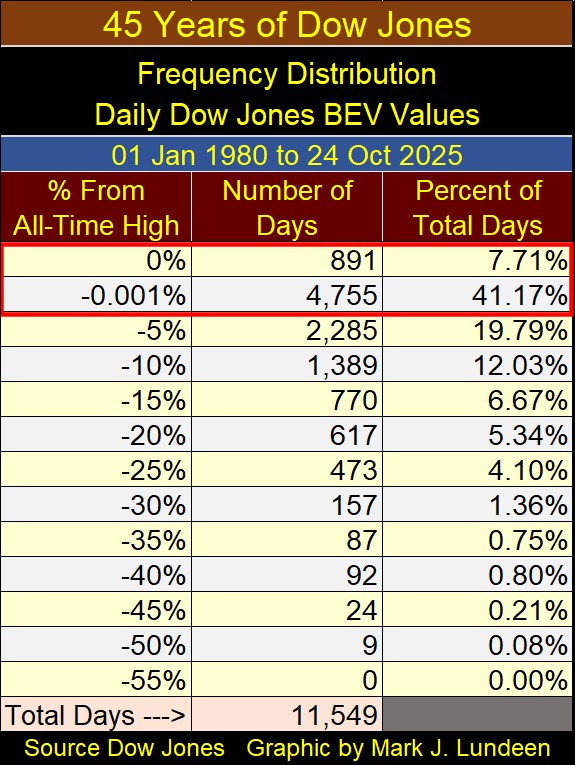 Let’s take a quick look at the past forty-five years for the Dow Jones, in terms of new all-time highs, and percentage claw-backs from those all-time highs, in the frequency table below. Since 1980, the Dow Jones has seen 891 new all-time highs, or 7.71% of the 11,549 daily closings in this sample, as seen in this table’s 0% row. Daily closings in scoring position, found in this table’s -0.001% row, were 4,755, or 41.17% of daily closings in the sample.