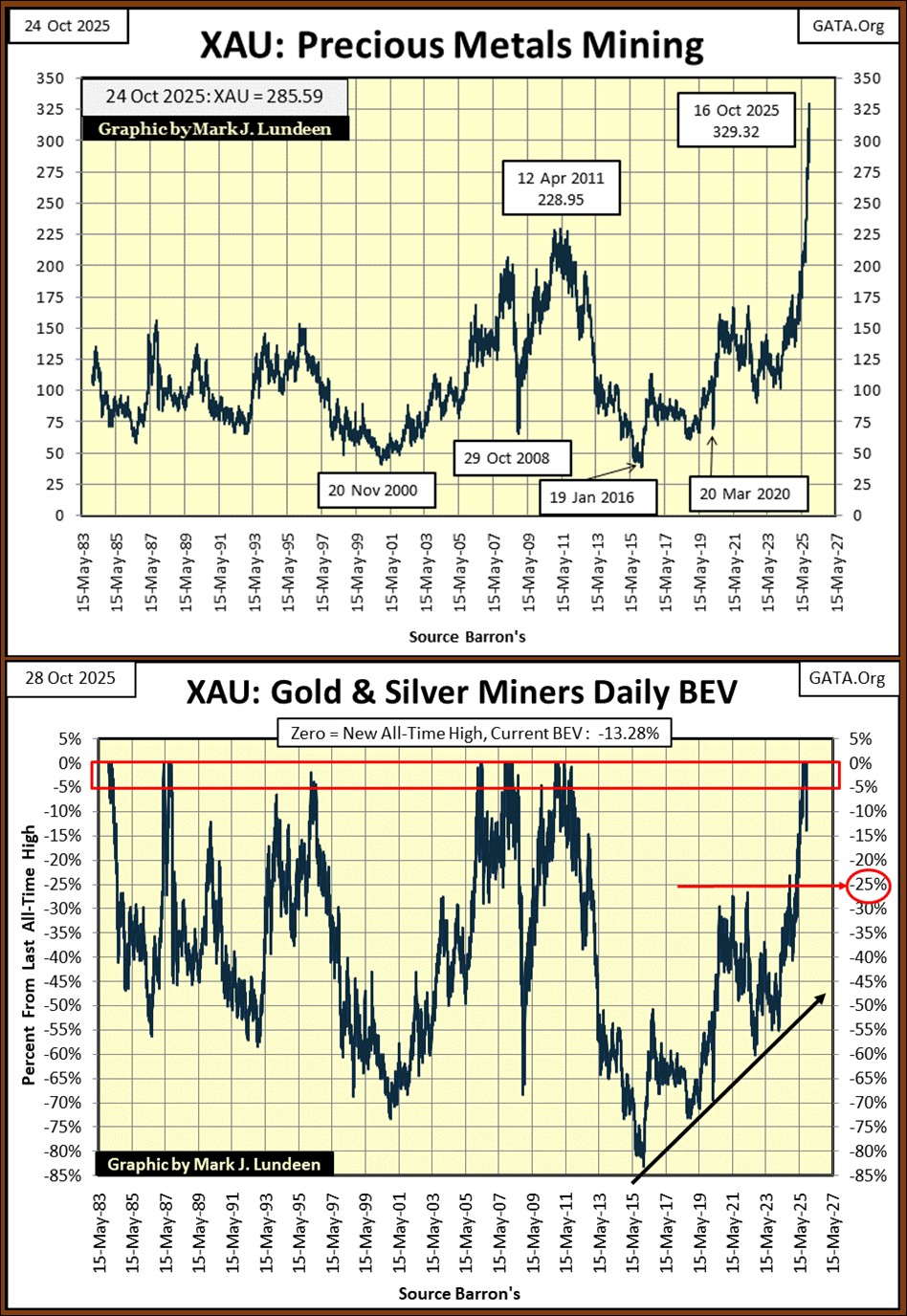 Since the XAU was first published in December 1983, it has been a volatile index, as seen in its BEV chart above.