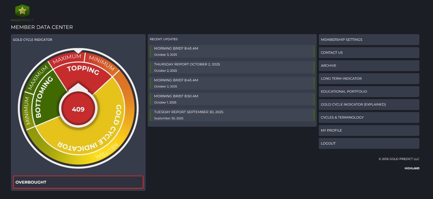 Our Gold Cycle Indicator is currently at 409, signaling maximum cycle topping conditions and suggesting a top may be nearby.